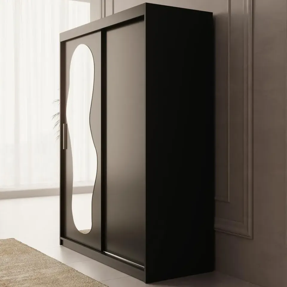 Kledingkast Ulysses beschikt over 2 schuifdeuren die openen met zilverkleurige handgrepen. De linkerdeur is voorzien van een speelse spiegel. De binnenkant bestaat uit 5 opbergvakken en 2 kledingroedes. De kast is uitgevoerd in zwarte kleur. Het meubel wordt ongemonteerd geleverd. Je dient het dus met behulp van de bijgeleverde handleiding zelf in elkaar te zetten.