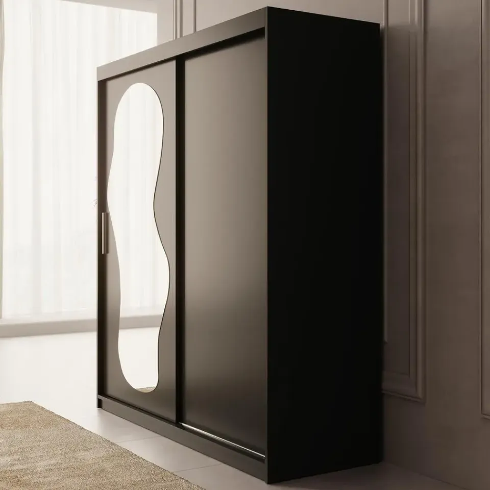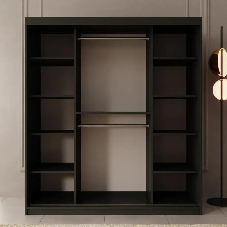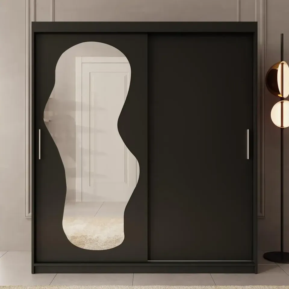 Kledingkast Ulysses beschikt over 2 schuifdeuren die openen met zilverkleurige handgrepen. De linkerdeur is voorzien van een speelse spiegel. De binnenkant bestaat uit 10 opbergvakken en 2 kledingroedes. De kast is uitgevoerd in zwarte kleur. Het meubel wordt ongemonteerd geleverd. Je dient het dus met behulp van de bijgeleverde handleiding zelf in elkaar te zetten.