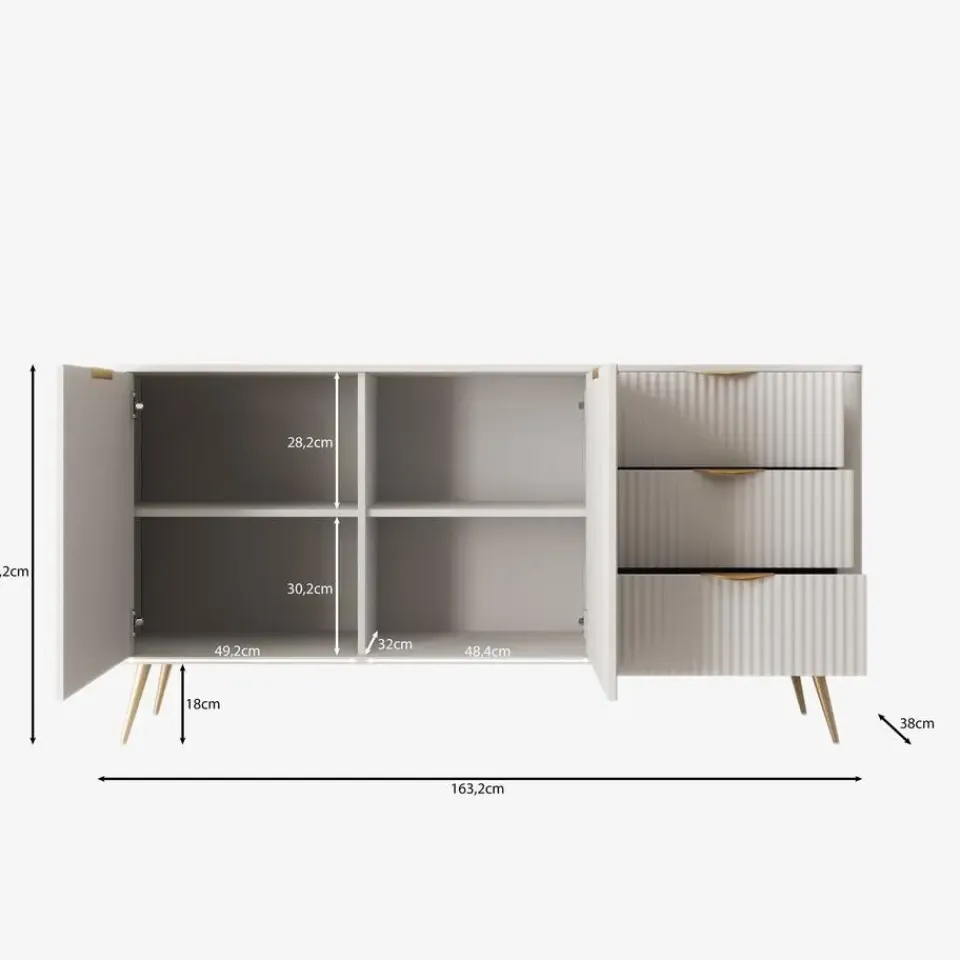 Dressoir Lima is gemaakt in een witte kleur. De opbergkast beschikt over 3 lades en 2 deuren waarachter 4 opbergvakken zitten. De lades en deuren openen met goudkleurige handgrepen. De kast staat op metalen poten. Het meubel wordt ongemonteerd geleverd. Je dient het dus met behulp van de bijgeleverde handleiding zelf in elkaar te zetten.