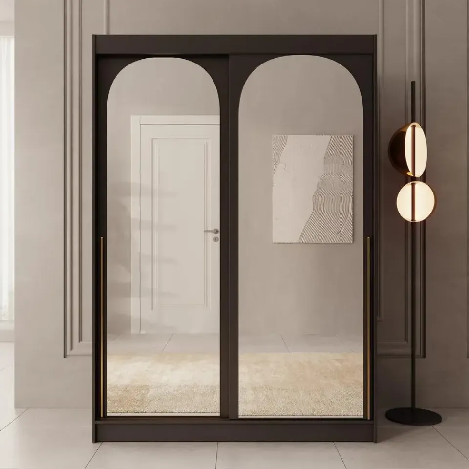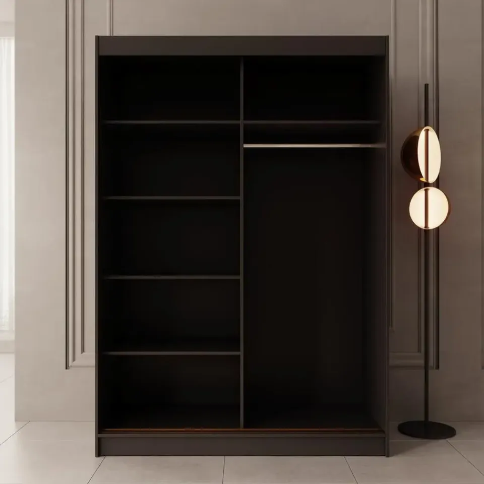Kledingkast Moniq heeft 2 schuifdeuren die openen met goudkleurige handgrepen. Op beide deuren zit een spiegel. De binnenkant bestaat uit 1 kledingroede en 6 opbergvakken. Het meubel is uitgevoerd in de kleur zwart en heeft een moderne uitstraling. Het meubel wordt ongemonteerd geleverd. Je dient het dus met behulp van de bijgeleverde handleiding zelf in elkaar te zetten.
