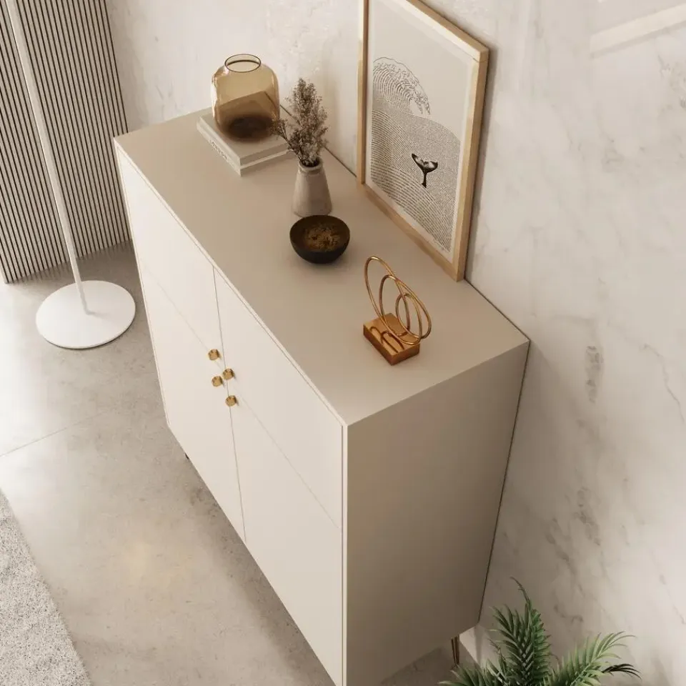 Dressoir Reunion is gemaakt in een beige kleur. De kast beschikt over 4 deuren waarachter 6 opbergvakken zitten. Deze deuren openen met goudkleurige handgrepen. Het meubel staat op metalen poten in de kleur goud. Het meubel wordt ongemonteerd geleverd. Je dient het dus met behulp van de bijgeleverde handleiding zelf in elkaar te zetten.