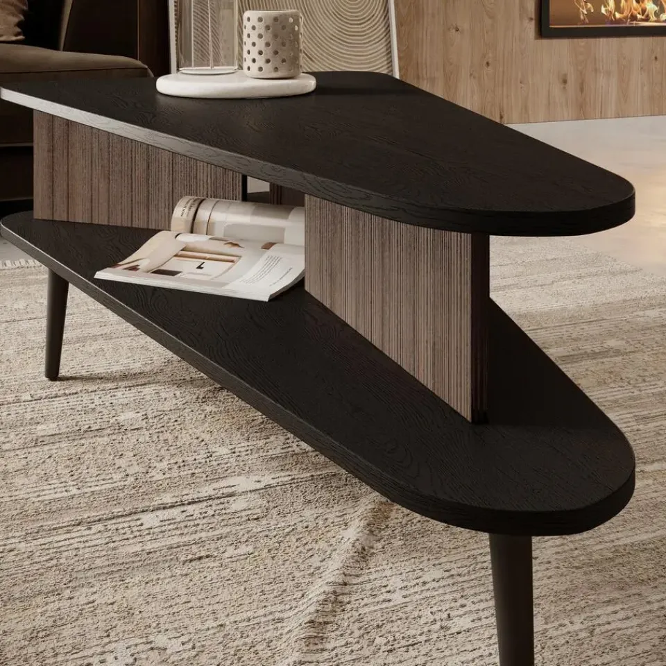 Salontafel Pedro is een speelsvormige tafel in zwart eiken met donker eiken kleur. De Pedro beschikt over een handige opbergplank en staat op metalen poten van 20 cm hoog. Het meubel wordt ongemonteerd geleverd. Je dient het dus met behulp van de bijgeleverde handleiding zelf in elkaar te zetten.