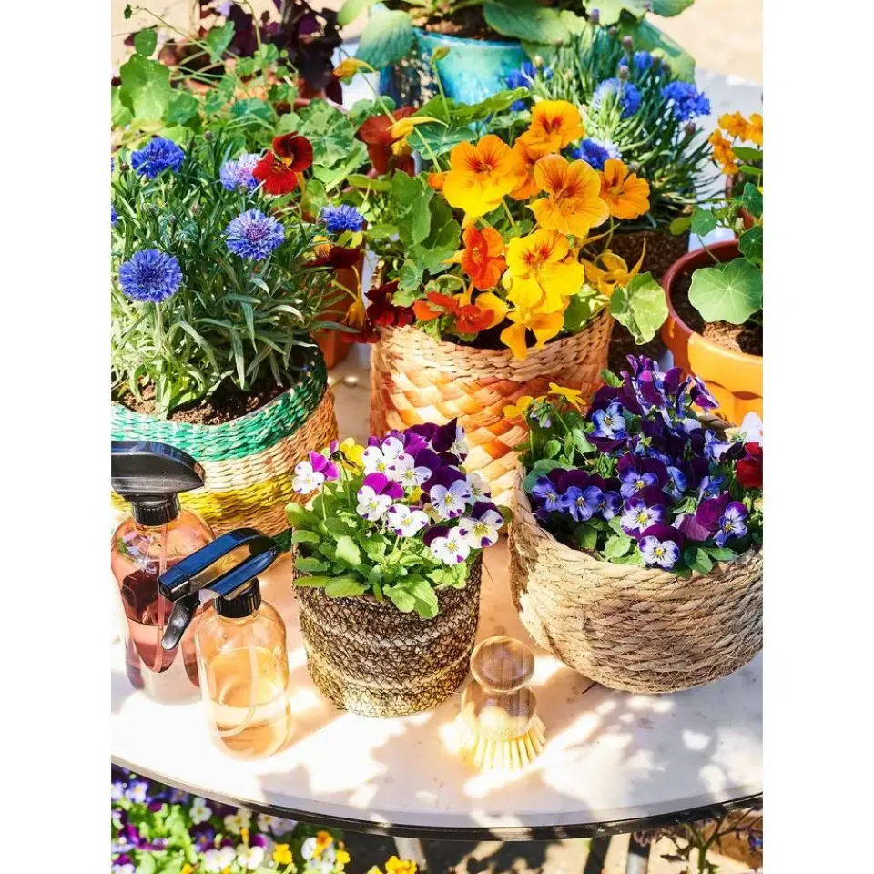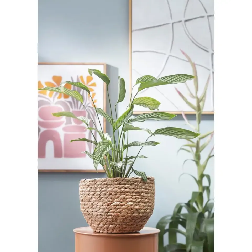 Naturel beige kleur rotan planten pot mand van gedraaid jute/touw/riet/zeegras van 24 cm hoogte en 26 cm diameter(buitenzijde). Voor de binnenmaat trek je 3 cm af. Mooie rotan jute manden/mandjes voor bloemen, bloemstukjes en planten met plastic aan de binnenkant zodat het water er niet door gaat. De ronde rieten mand heeft geen gaatjes aan de onderkant.
