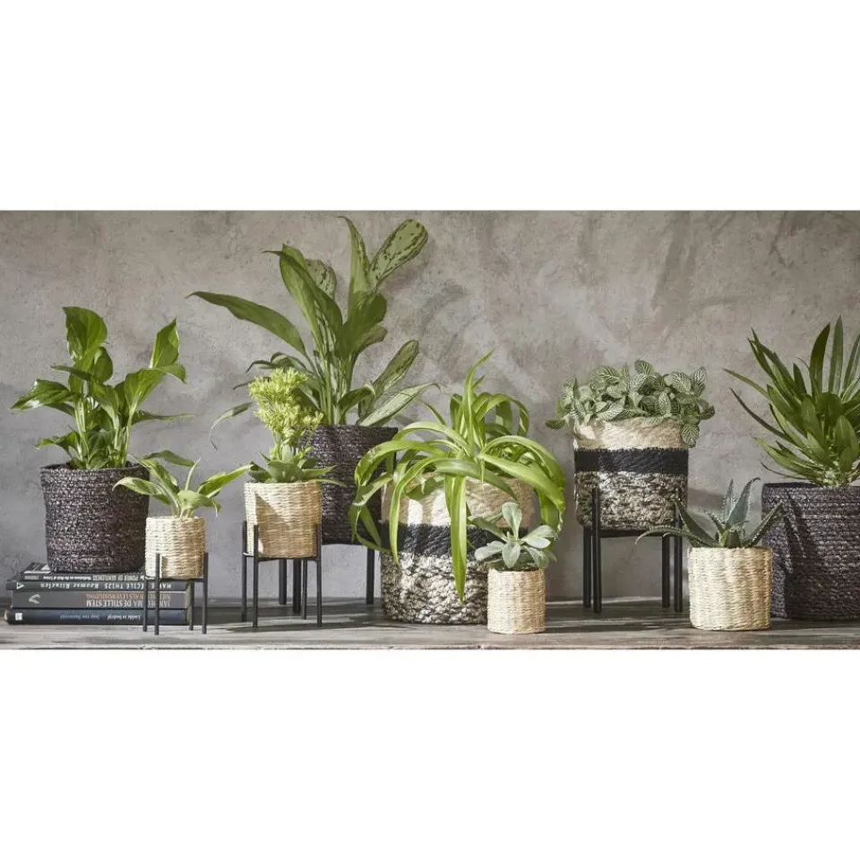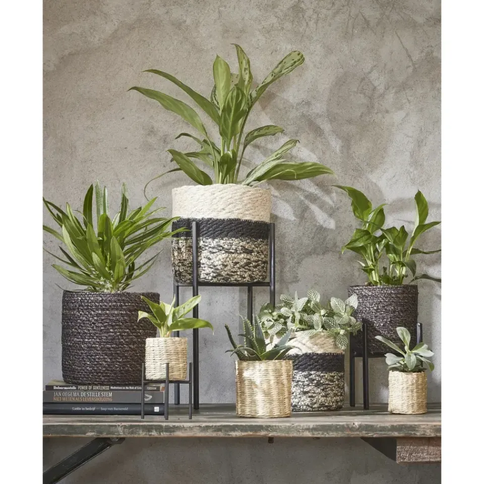Naturel zwart kleur rotan planten pot mand van gedraaid jute/touw/riet/zeegras van 20 cm hoogte en 20 cm diameter(buitenzijde). Voor de binnenmaat trek je 3 cm af. Mooie rotan jute manden/mandjes voor bloemen, bloemstukjes en planten met plastic aan de binnenkant zodat het water er niet door gaat. De ronde rieten mand heeft geen gaatjes aan de onderkant.