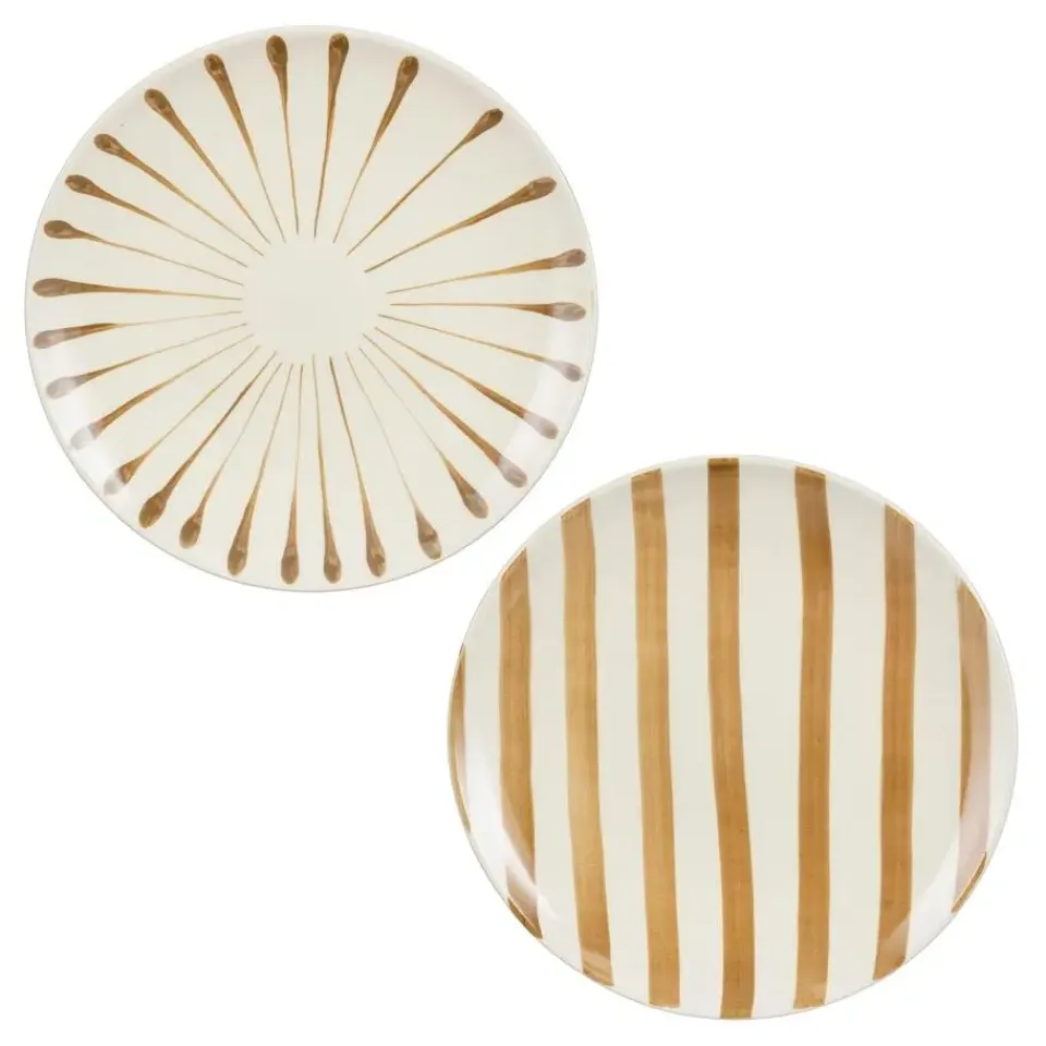 De Elsie dinerborden van Mica Decorations brengen feestelijkheid én stijl op tafel. De handgeschilderde strepen, met smalle en brede penseelstreken, geven elk bord een uniek karakter! Elk bord is gemaakt van sterk steengoed en is niet alleen stijlvol, maar ook praktisch: geschikt voor de oven tot 200 °C, magnetron en vaatwasser. Het bord heeft een hoogte van 3 cm en een diameter van 26 cm. Combineer het met de andere serviesstukken uit de Elsie-serie voor een complete en sfeervolle eettafel.