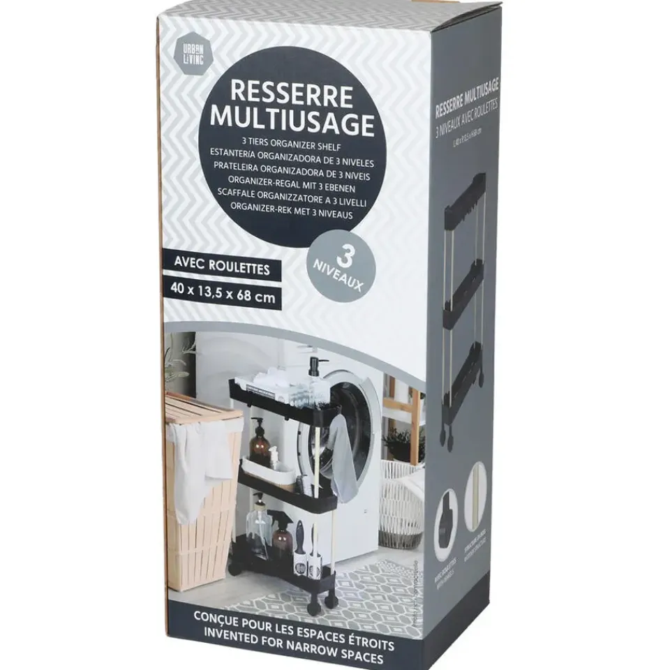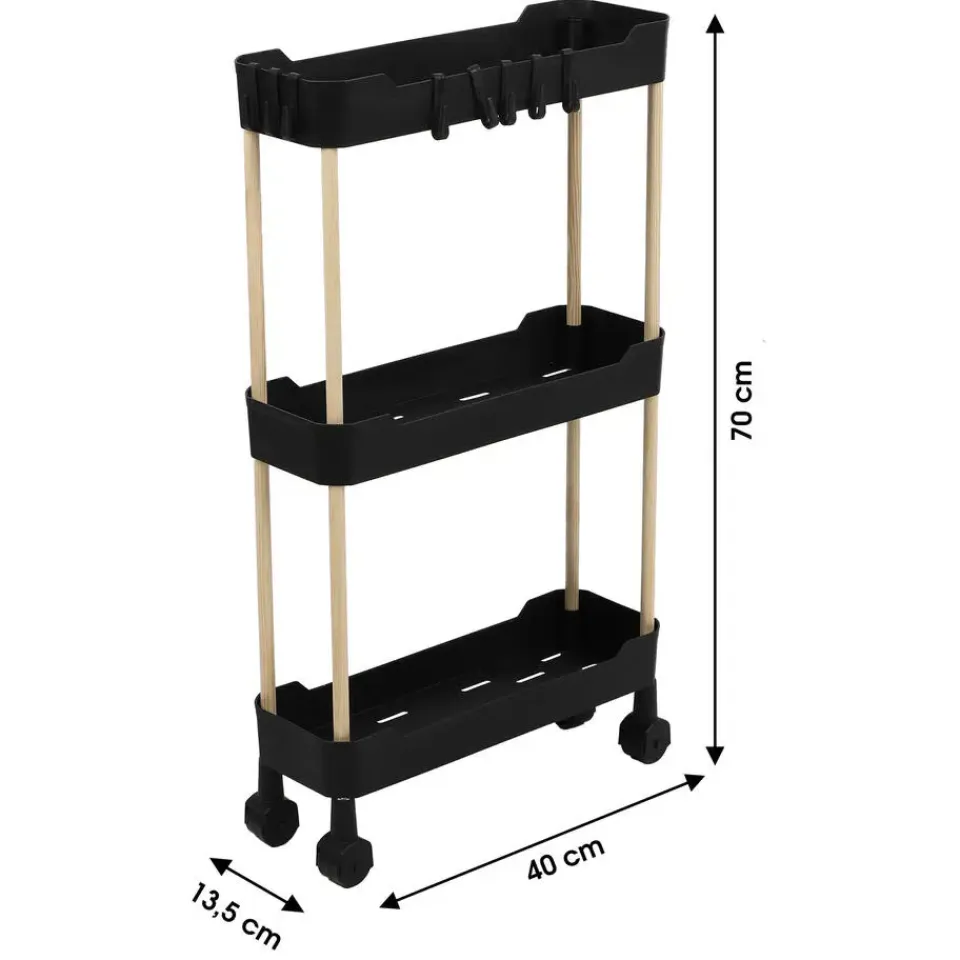 Keuken/badkamer opberg trolley van Modern Spirit. De 3-laags opberg trolley is de perfecte oplossing voor extra opbergruimte in je keuken, badkamer, hobbyruimte of kantoor. Met drie stevige mesh-manden, een stabiel houten frame en een strak zwart design is deze trolley zowel functioneel als stijlvol. Dankzij de soepele wieltjes verplaats je hem eenvoudig naar waar je hem nodig hebt.