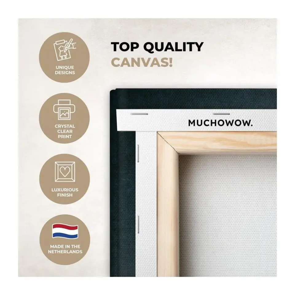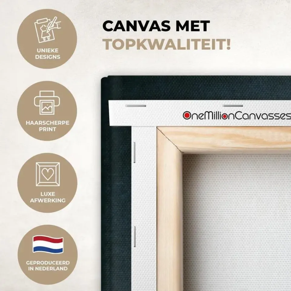 De foto wordt gedrukt op stevig 260 grams canvasdoek van 0,41 mm dik. Het linnen wordt strak gespannen op een houten spieraam frame van twee centimeter dik. Dit houten frame is gemaakt van FSC-gekeurd grenen kwaliteitshout. Bij het product is een ophangsysteem standaard inbegrepen om de print gemakkelijk aan de muur te bevestigen.