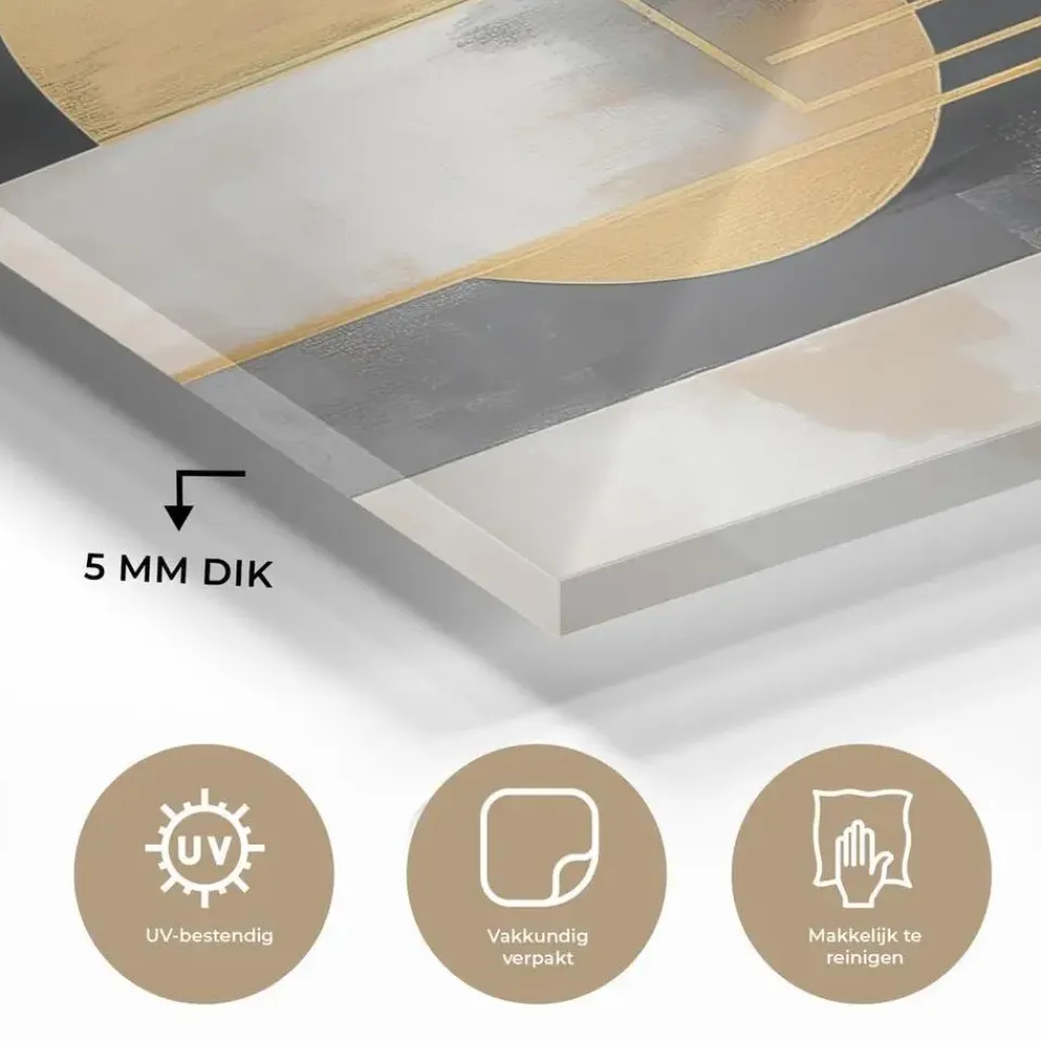 Het schilderij is gemaakt van kwalitatief hoogwaardig acrylaat glas. Daarnaast is het voorzien van een uitmuntend afwerkingsniveau en het is volledig bestand tegen UV-straling, zodat de kleuren niet vervagen en je jarenlang plezier kunt beleven aan het glasschilderij.