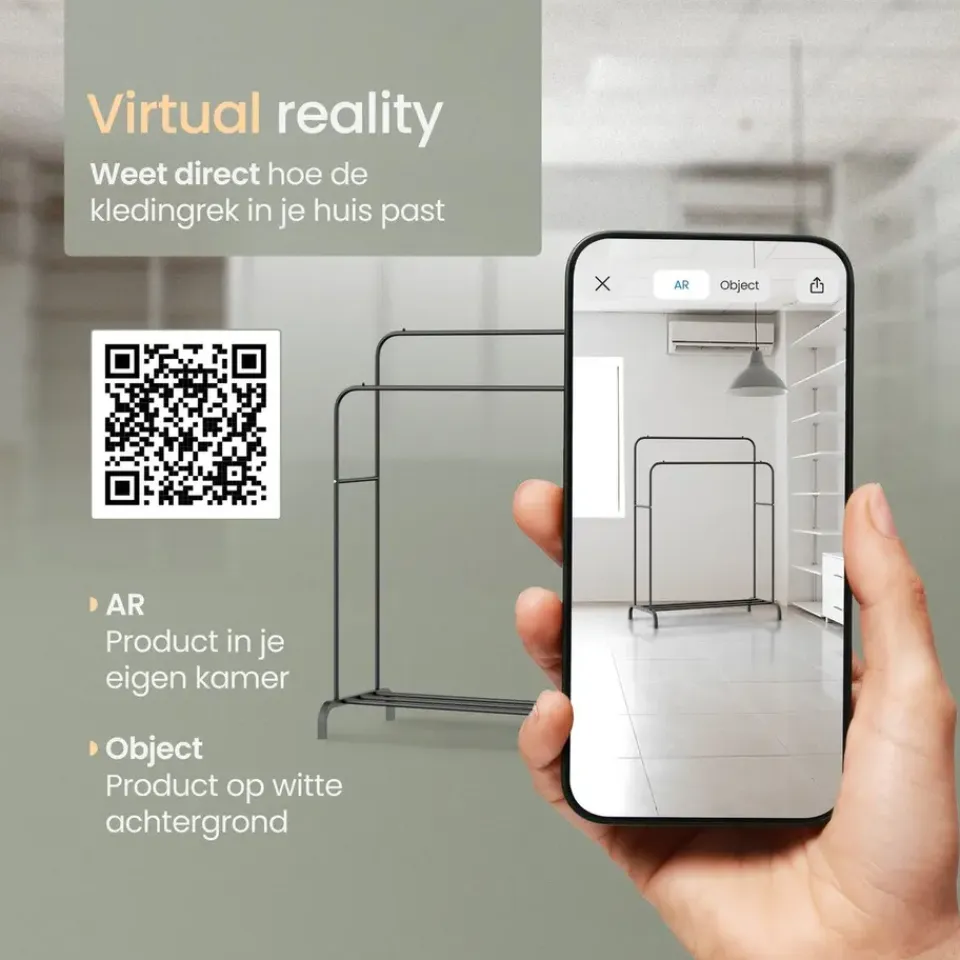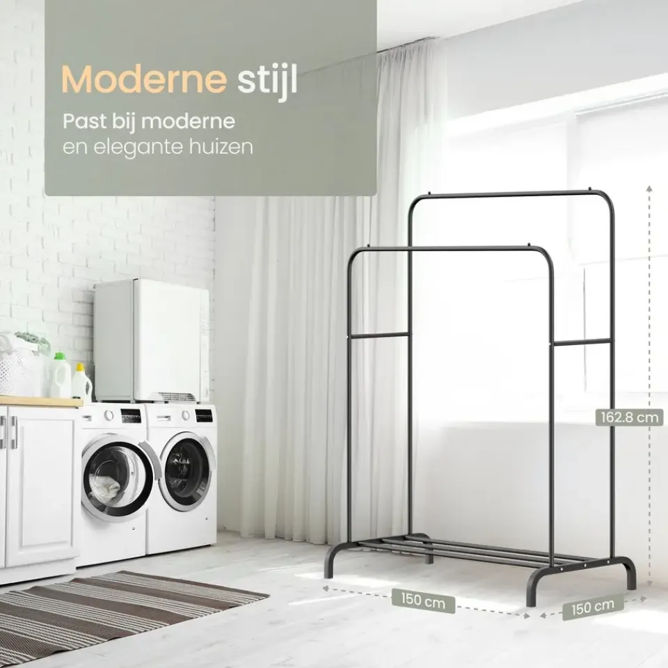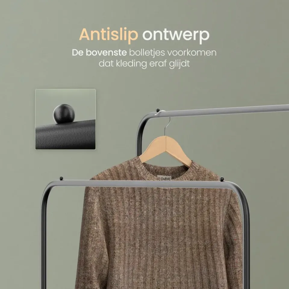 Stabiliteit is essentieel bij een kledingrek, en dat is precies wat dit product biedt. Het kledingrek is gemaakt van hoogwaardige, gepoedercoate metalen buizen met een dikte van 19 mm. Hierdoor staat ‘ie stevig op zijn plek. Met een draagvermogen van 50 kg, verdeeld over de twee stangen, kun je zonder zorgen al je kledingstukken ophangen. Ondanks de robuuste constructie is het rek licht van gewicht en gemakkelijk te verplaatsen.