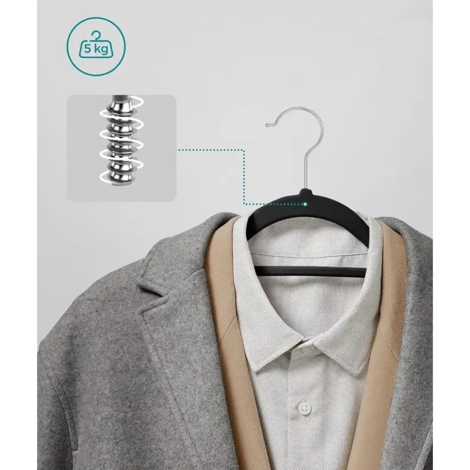 Het dunne profiel van deze hangers zorgt ervoor dat je meer kleding kunt ophangen in dezelfde ruimte. Of je nu een kleine kast hebt of gewoon meer wilt organiseren, de hangers helpen je om ruimte te besparen zonder in te leveren op stevigheid. De kleine middelste stang biedt ook een handige plek voor accessoires zoals stropdassen of sjaals, zodat je kleding netjes en compleet blijft.