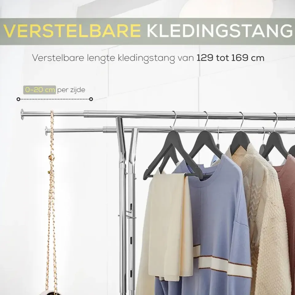 Dit kledingrek is uitgerust met vier robuuste zwenkwielen, waarvan twee met een remfunctie. Dit maakt het eenvoudig om het rek te verplaatsen, zelfs wanneer het volledig beladen is. Het rek is daarom perfect voor dynamische omgevingen zoals modeshows, kledingwinkels of dagelijks gebruik thuis. De onderste dwarsbalk biedt extra bergruimte voor schoenen of opbergdozen, wat het ordenen van ruimtes verder vergemakkelijkt.