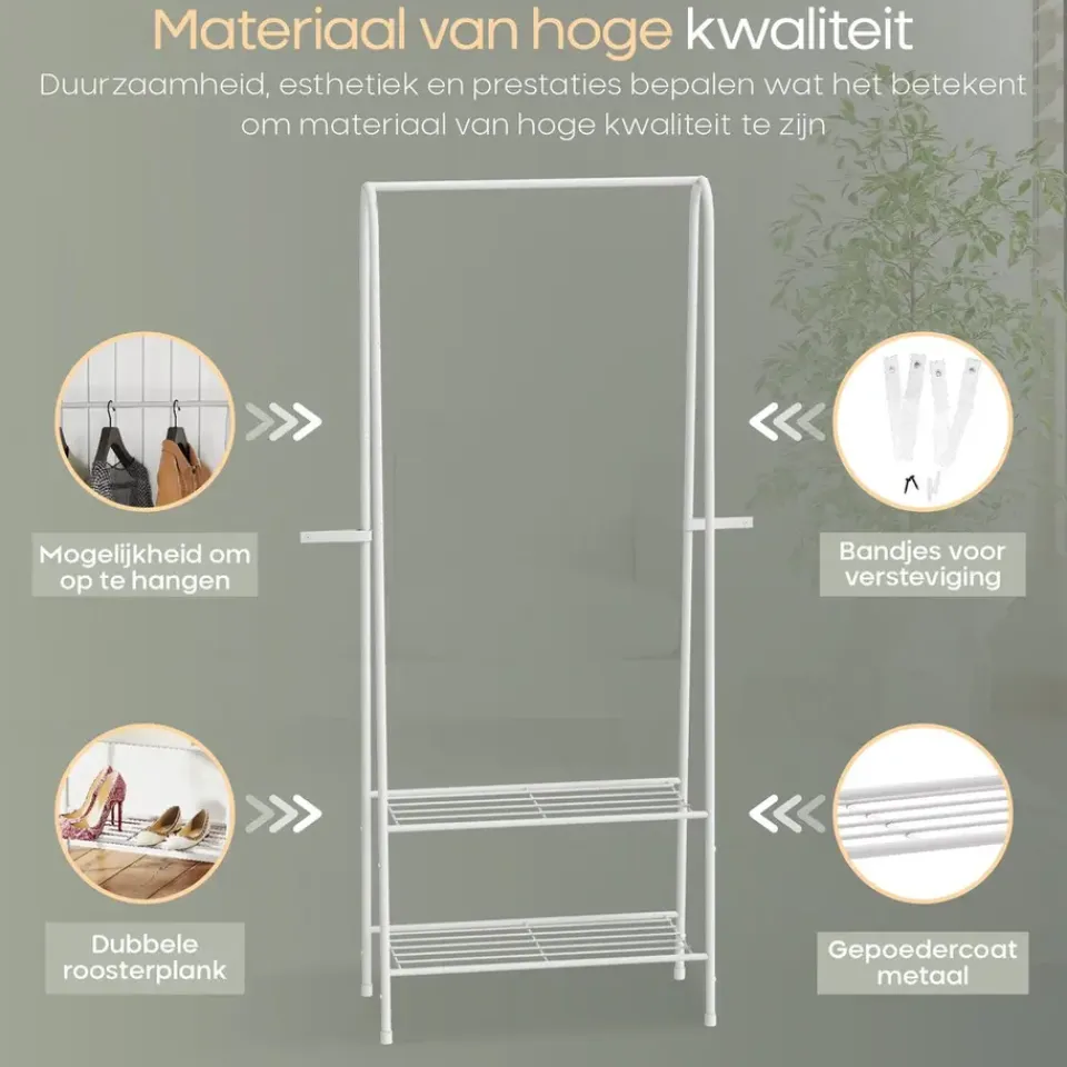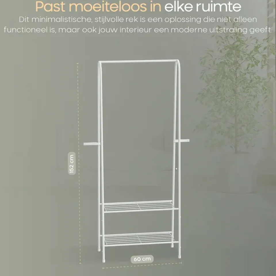 Dit kledingrek biedt een combinatie van functionaliteit en esthetiek. Het is perfect voor mensen die efficiënt gebruik willen maken van beperkte ruimte, terwijl het ook een stijlvolle uitstraling toevoegt aan de kamer. Gebruik het in kleine appartementen, studentenkamers of zelfs als aanvulling in een inloopkast om je kleding netjes en overzichtelijk op te bergen.