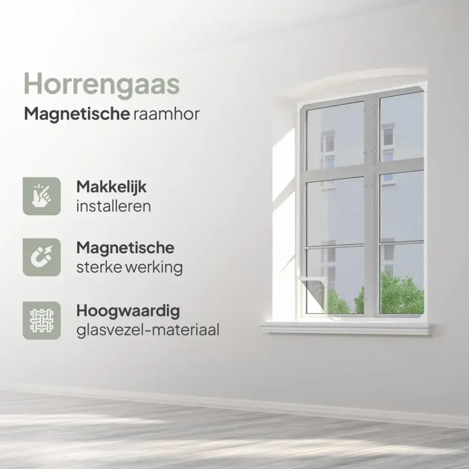 MAKKELIJKE MONTAGE: Montage van de raamhor is heel gemakkelijk. Je plakt de magneetstrip op het kozijn. Daarna maak je het plastic frame op maat wat zeer makkelijk is door de meegeleverde hoekjes. Hierop bevestig je strak het horrengaas op, doormiddel van de magneetstrip in het plastic frame te klikken. Het overige materiaal knip of snij je eraf en de magneten zorgen ervoor dat het vastzit.