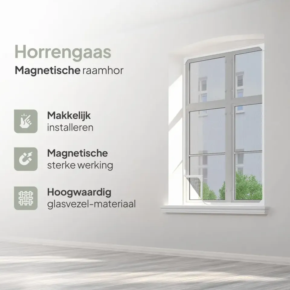 MAKKELIJKE MONTAGE: Montage van de raamhor is heel gemakkelijk. Je plakt de magneetstrip op het kozijn. Daarna maak je het plastic frame op maat wat zeer makkelijk is door de meegeleverde hoekjes. Hierop bevestig je strak het horrengaas op, doormiddel van de magneetstrip in het plastic frame te klikken. Het overige materiaal knip of snij je eraf en de magneten zorgen ervoor dat het vastzit.