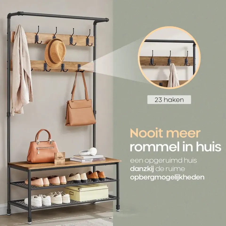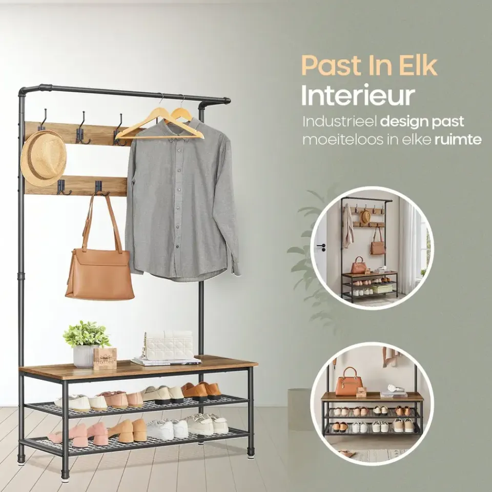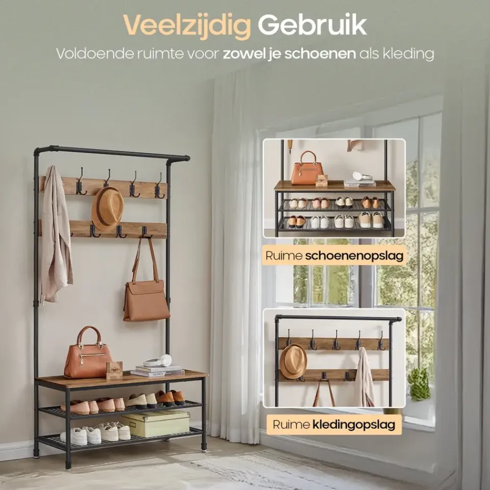 De combinatie van gepoedercoat metaal en hout in een rustieke stijl zorgt voor een stevig en duurzaam meubel. Het metaal is beschermd tegen roest, terwijl de houten planken een stijlvolle en beschermende fineerlaag hebben. De bank biedt niet alleen een comfortabele zitplek, maar kan ook tot 100 kg dragen, waardoor hij perfect is voor dagelijks gebruik. De stevige haken kunnen elk tot 3 kg dragen, zodat ook zware winterjassen gemakkelijk opgehangen kunnen worden.