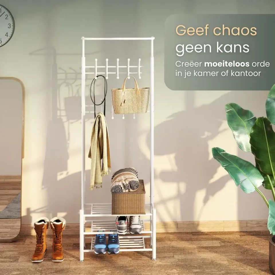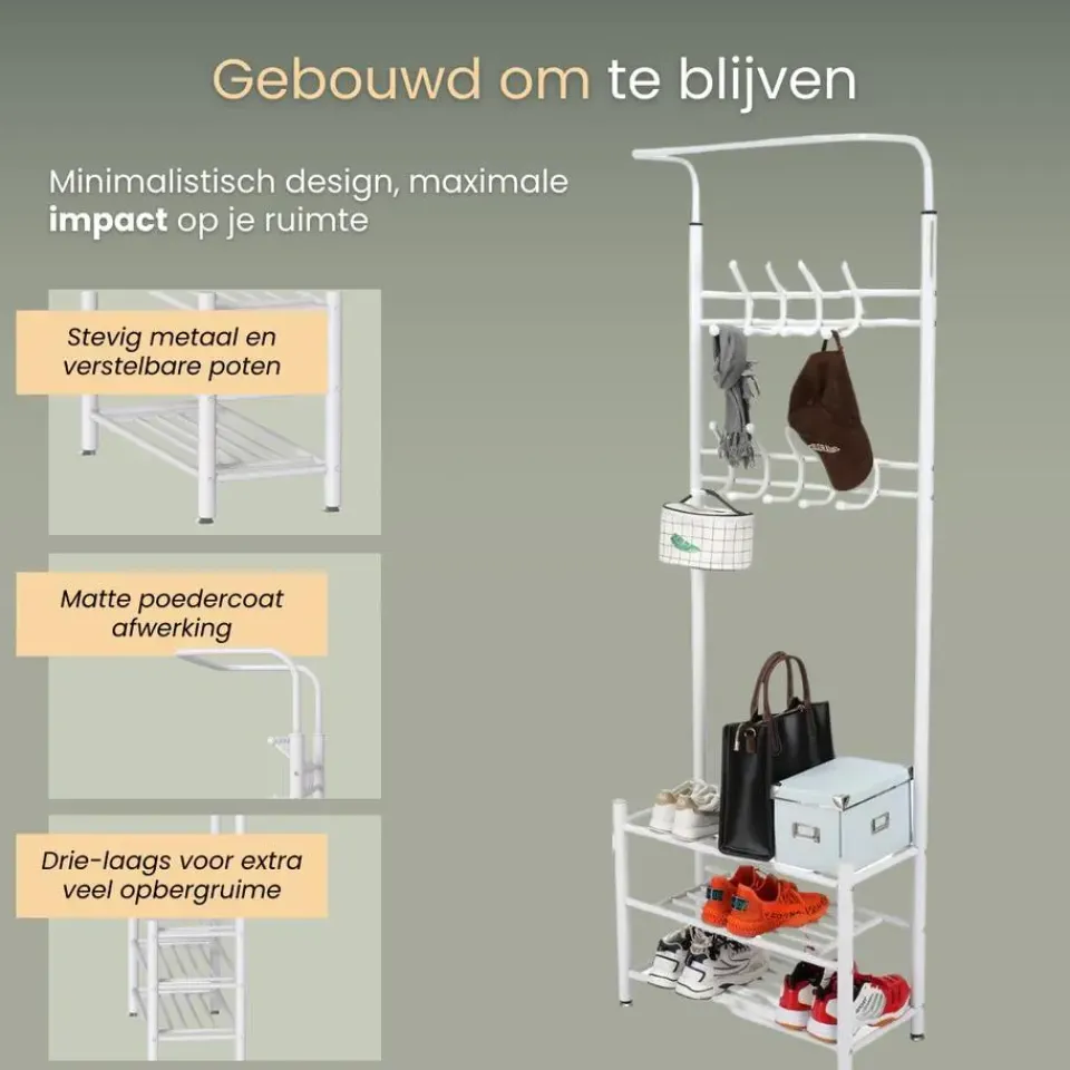 - Multifunctioneel ontwerp voor jassen, hoeden, schoenen en meer.