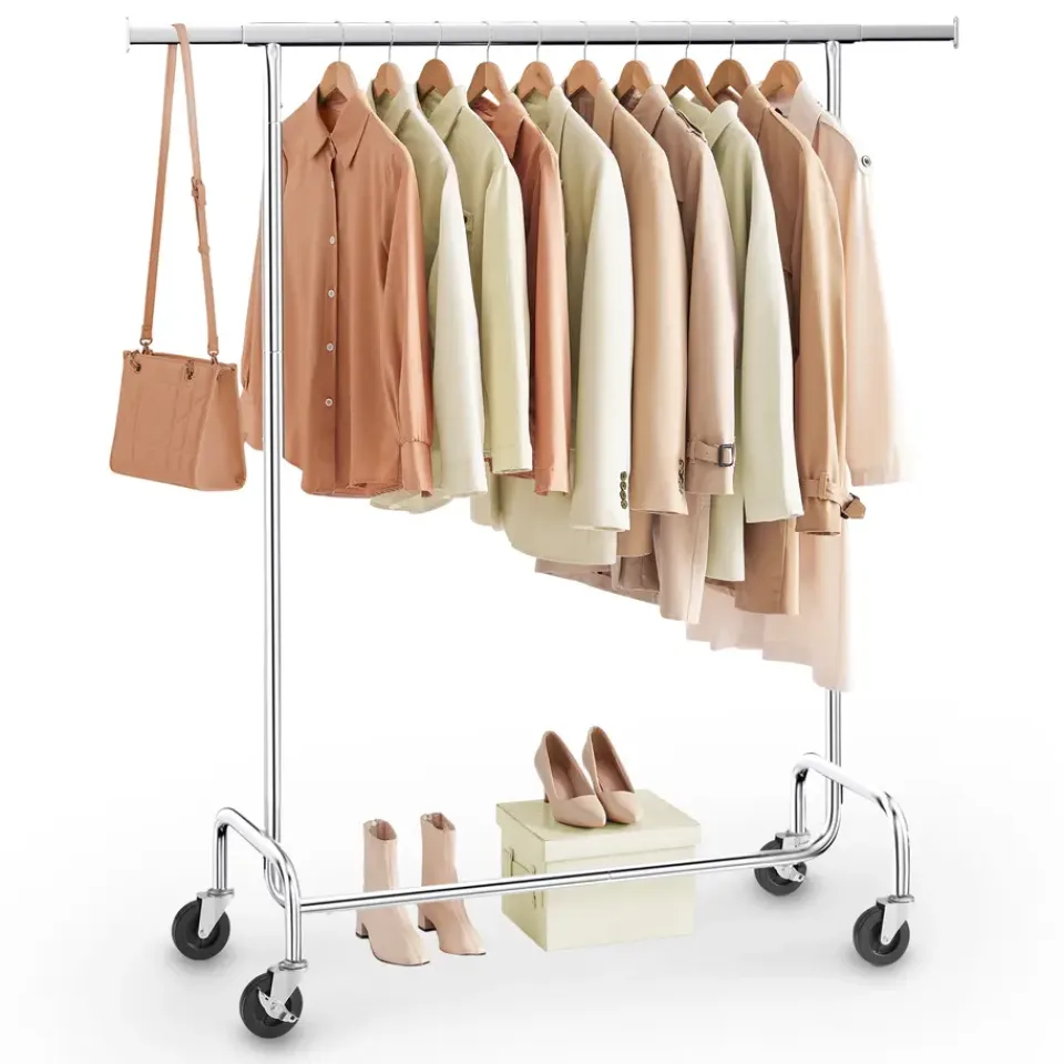 Dit kledingrek is uitgerust met vier robuuste zwenkwielen, waarvan twee met een remfunctie. Dit maakt het eenvoudig om het rek te verplaatsen, zelfs wanneer het volledig beladen is. Het rek is daarom perfect voor dynamische omgevingen zoals modeshows, kledingwinkels of dagelijks gebruik thuis. De onderste dwarsbalk biedt extra bergruimte voor schoenen of opbergdozen, wat het ordenen van ruimtes verder vergemakkelijkt.