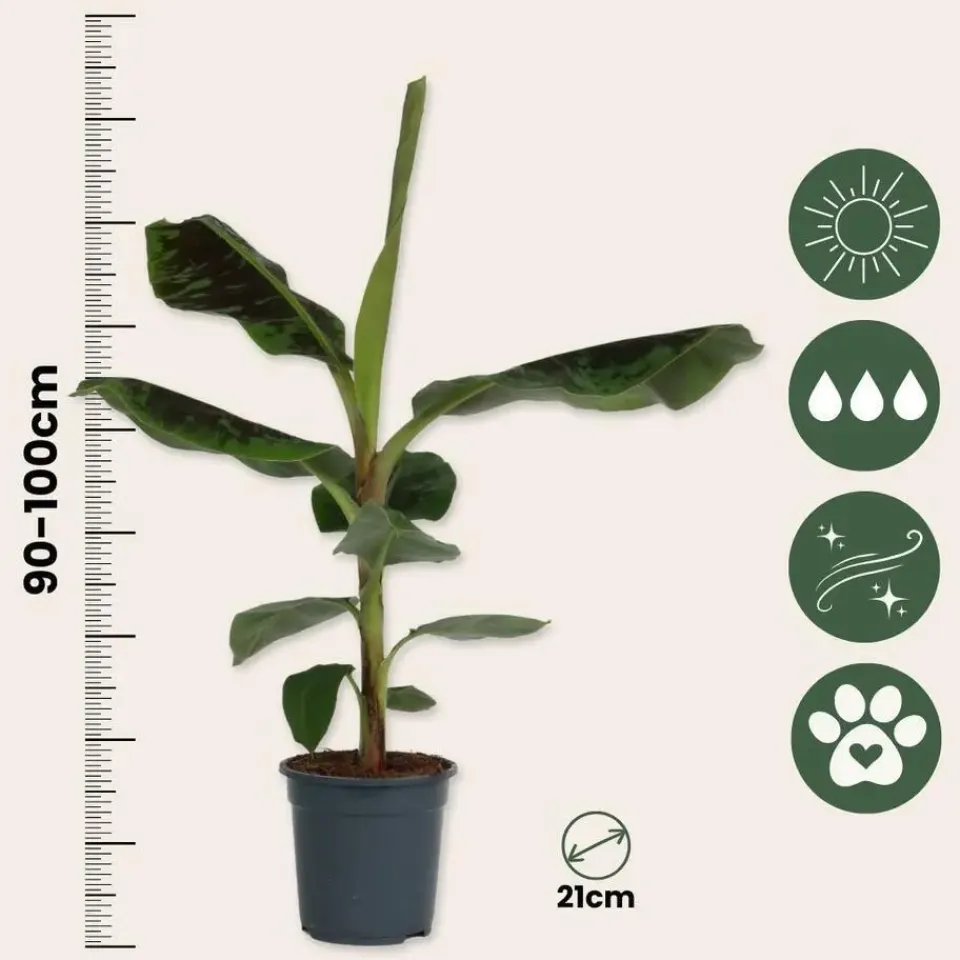 De Musa bestaat voor ongeveer 80% uit water en houdt daarom van een flinke slok water. Geef de plant dus regelmatig water en zorg ervoor dat de grond nooit uitdroogt. Musa houdt ook van regen. Trakteer het daarom op een zomerregen. Je kunt de plant ook regelmatig besproeien. Daarnaast houdt de Musa van licht en warmte, zet hem dus niet speciaal in de schaduw. Minimaal 5 uur direct zonlicht per dag bevordert de groei. De bladeren kunnen op een gegeven moment bruine randen krijgen. Hierna sterft het hele blad af. Dit is een natuurlijk proces, dus wees hier niet ongerust over. Op deze manier vervangt de Musa oude bladeren door nieuwe bladeren bovenaan de plant.