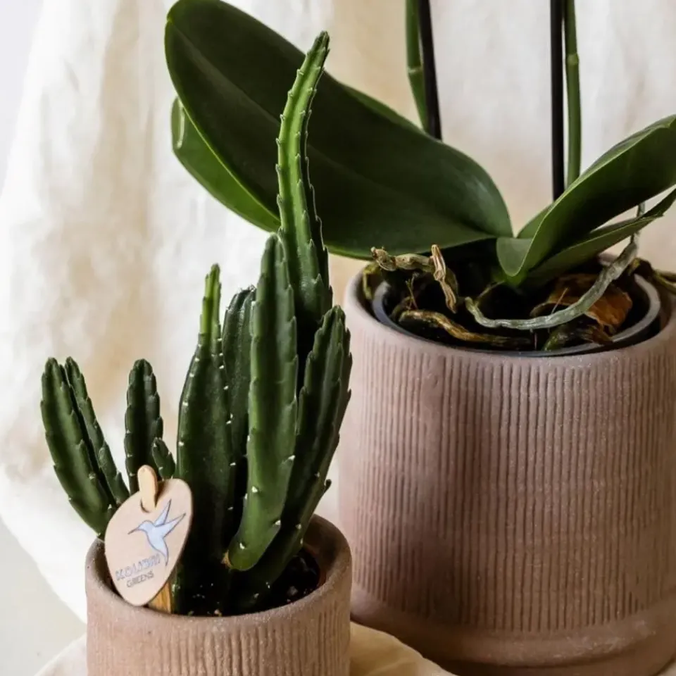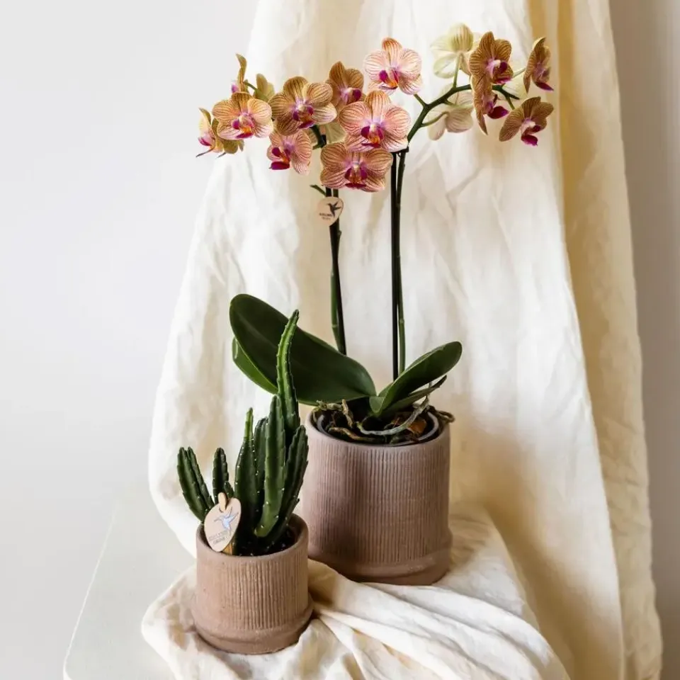 De Phalaenopsis orchidee staat graag op een lichte plek, maar niet in fel zonlicht. Geef één keer per week water door de pot kort in lauwwarm water te dompelen en goed te laten uitlekken. Verwijder uitgebloeide bloemen en knip de tak pas terug als hij helemaal is verdroogd. De succulent heeft nog minder nodig: een scheutje water om de twee à drie weken is genoeg. Beide planten zijn eenvoudig te verzorgen en zorgen lang voor sfeer en plezier in huis.