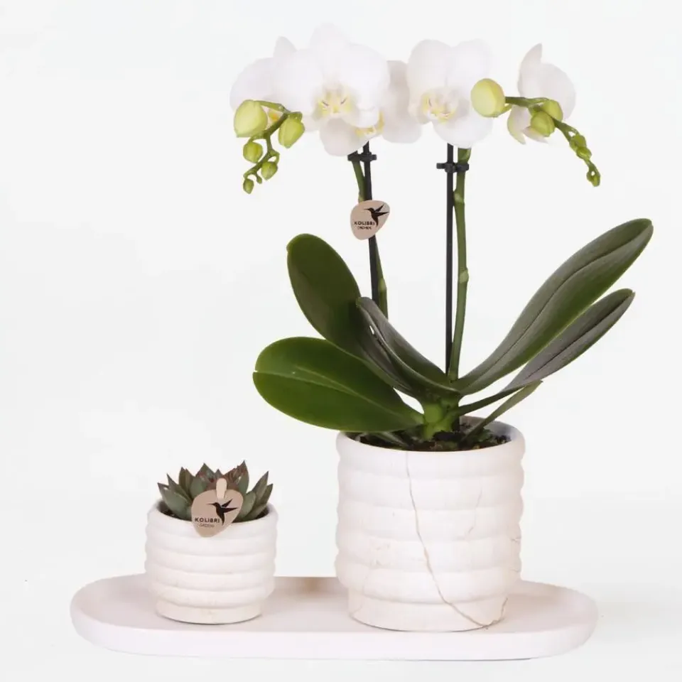 Deze stijlvolle set combineert een elegante Phalaenopsis orchidee met een speelse mini-succulent, beide in bijpassende potten op een houten tray. De orchidee straalt luxe en kleur uit met haar rijke bloemen, terwijl de succulent zorgt voor een moderne uitstraling. Samen vormen ze een harmonieus duo dat perfect is als cadeau of eyecatcher in huis. De planten zijn eenvoudig te verzorgen en blijven lang mooi. Een ideaal geschenk voor elke gelegenheid.