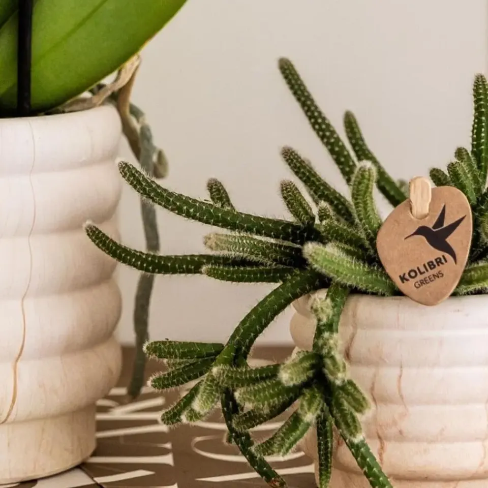 De Phalaenopsis orchidee staat graag op een lichte plek, maar niet in fel zonlicht. Geef één keer per week water door de pot kort in lauwwarm water te dompelen en goed te laten uitlekken. Verwijder uitgebloeide bloemen en knip de tak pas terug als hij helemaal is verdroogd. De succulent heeft nog minder nodig: een scheutje water om de twee à drie weken is genoeg. Beide planten zijn eenvoudig te verzorgen en zorgen lang voor sfeer en plezier in huis.