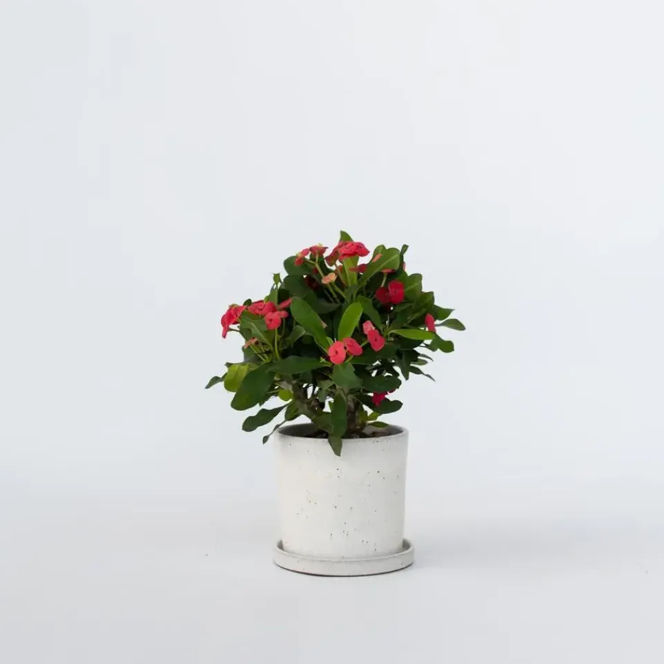 Euphorbia milii, beter bekend als de Christusdoorn, is een bloeiende vetplant die oorspronkelijk uit Madagaskar komt. Van de takken van de Euphorbia Milii zou de kroon van Christus gevlochten zijn, waardoor hij bekend staat als de Christusdoorn. Deze plant is populair vanwege zijn onderhoudsvriendelijkheid en droogtetolerantie, waardoor droge lucht vanwege de verwarming bijvoorbeeld geen probleem is. Euphorbia milii bloeit met kleine, roze bloemen van maart tot september. De plant ziet er prachtig uit, maar het is belangrijk om voorzichtig te zijn, want het giftige sap kan huidirritatie veroorzaken.