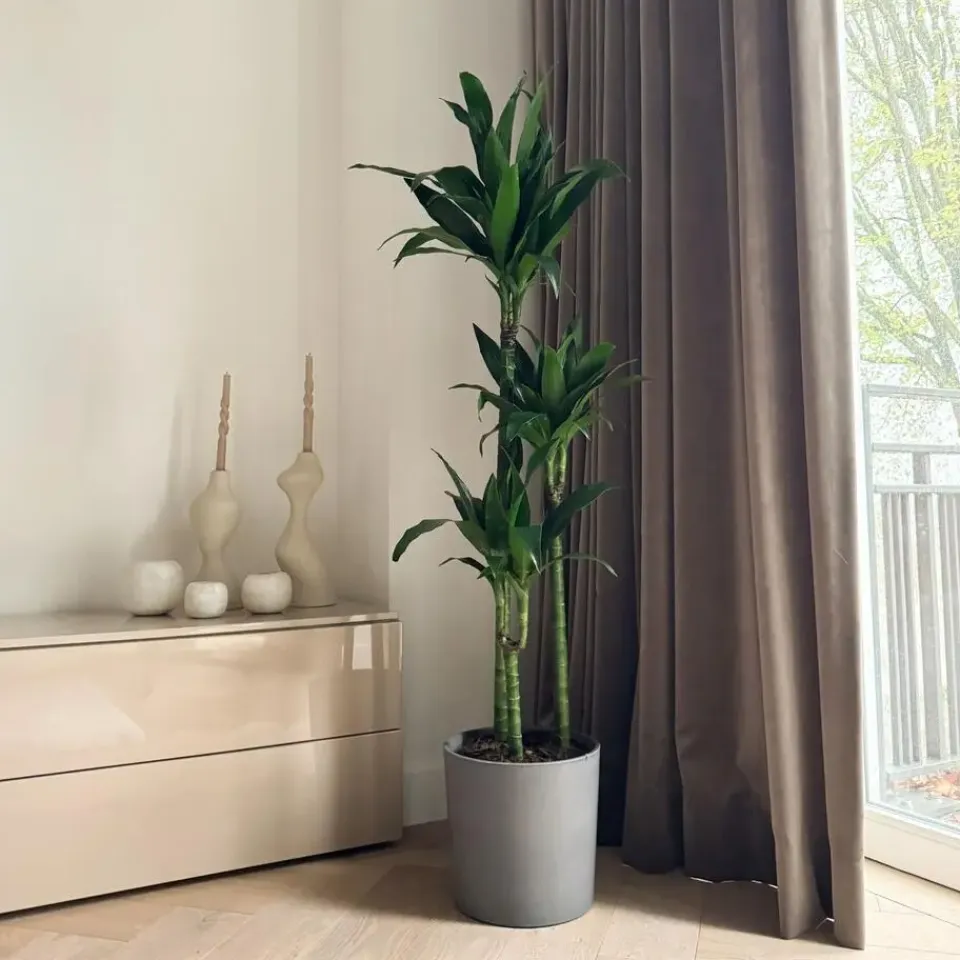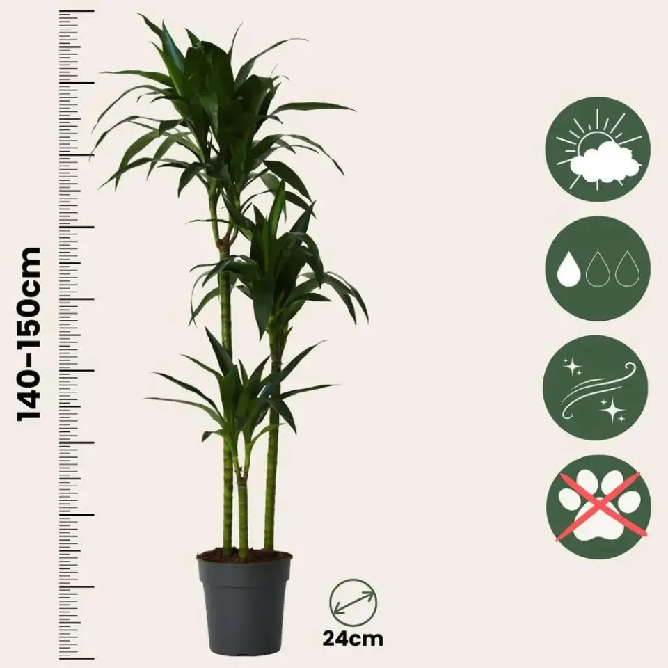 De plant heeft bij levering een hoogte van 140-150cm, gemeten inclusief de kwekerspot. De plant wordt geleverd in een kwekerspot met een diameter van 24cm.