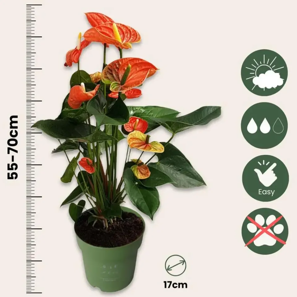De Anthurium is makkelijk te verzorgen. Geef matig water en houd de grond licht vochtig zonder overtollig water. Zet de plant op een lichte plek met gefilterd zonlicht of in de halfschaduw. De ideale temperatuur ligt tussen 18 en 22 graden Celsius. Houd er rekening mee dat deze plant giftig kan zijn en plaats haar buiten bereik van huisdieren en kleine kinderen. Dankzij haar langdurige bloei en minimale verzorging brengt deze Anthurium het hele jaar door kleur in huis.