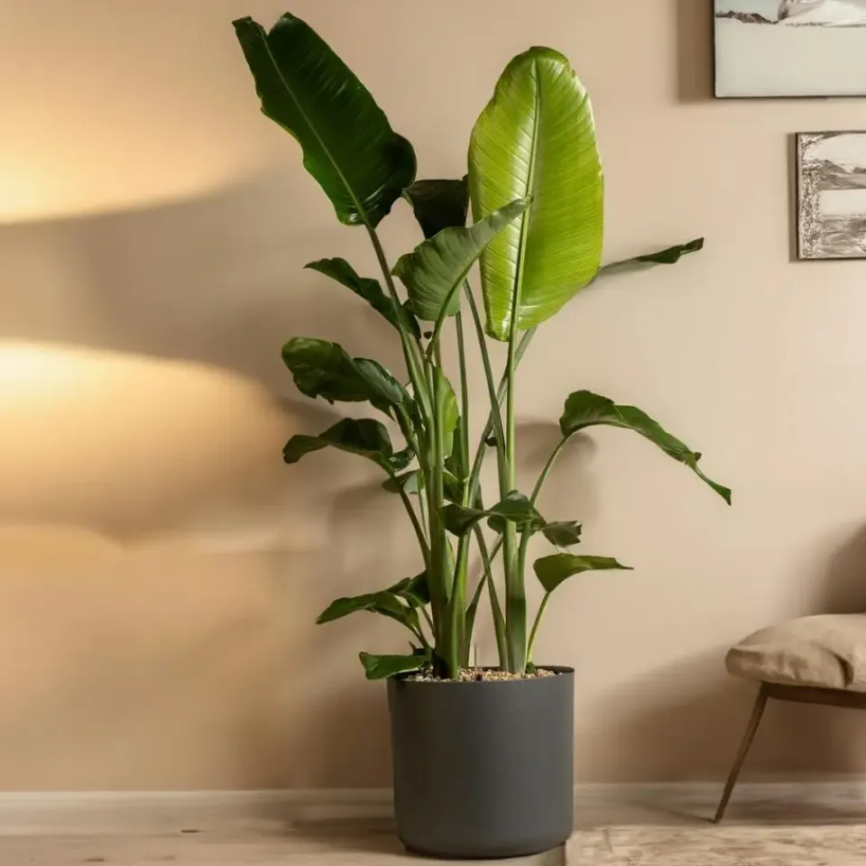 Dé meest populaire groene kamerplant op dit moment is bij uitstek de Strelitzia Nicolai, ook wel Paradijsvogelplant genoemd. Waar de plant voorheen erg populair was vanwege zijn prachtige bloemen is hij de laatste tijd vooral geliefd door zijn prachtige en exotische, groene bladeren. Deze gigantische Paradijsvogel plant is met zijn grote en stevige grijsachtige bladeren een prachtige kamerplant voor ieder interieur. De Strelitzia is een van de meest exclusieve bloeiende kamerplanten. Deze prachtige, grote paradijsvogelplant komt oorspronkelijk uit Zuid-Afrika. De exotische planten zijn echte eyecatchers met bloemen die doen denken aan vogeltjes.