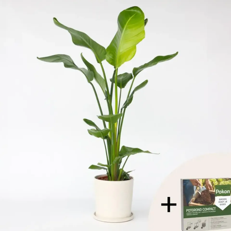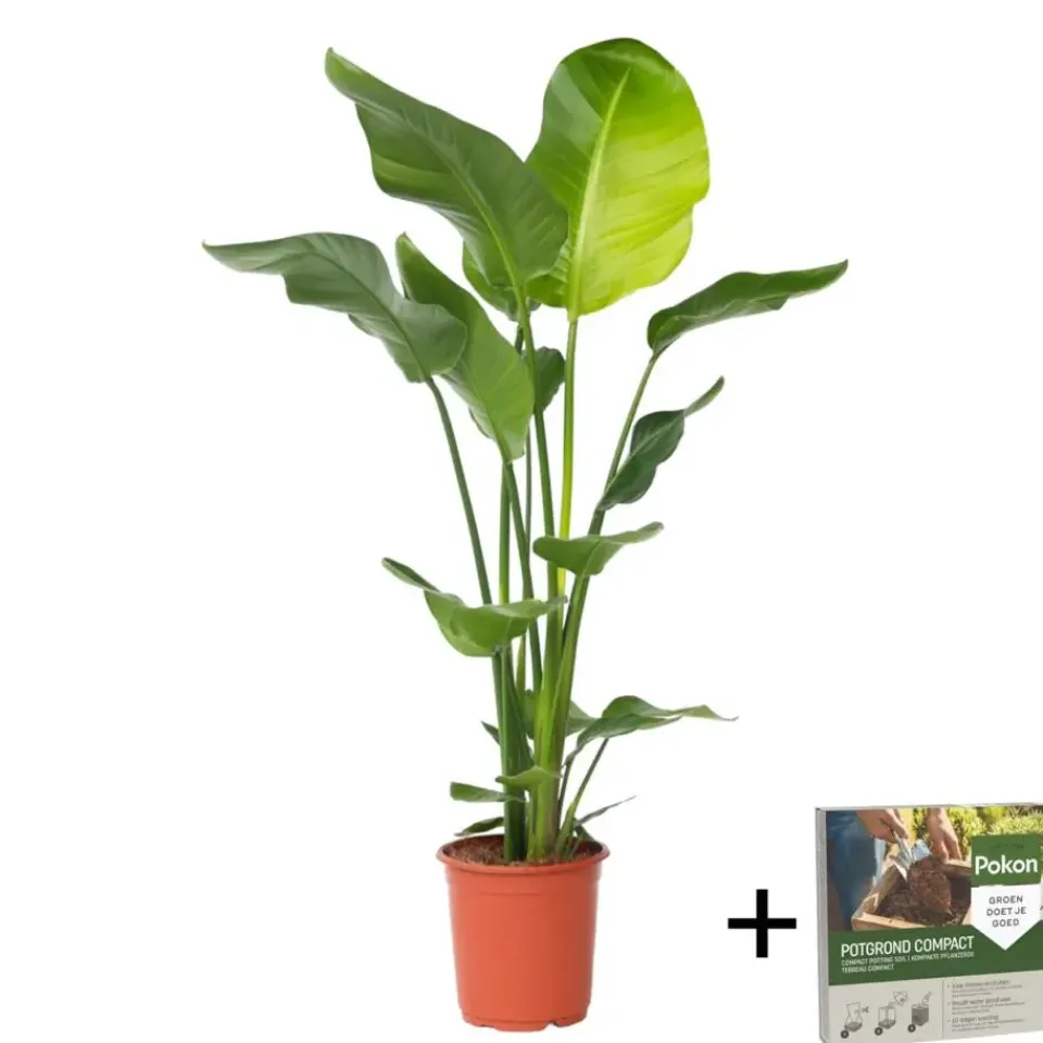 De Strelitzia Nicolai is een echte zonaanbidder en geeft daarom de voorkeur aan een plek met veel licht. Hierdoor heeft de plant ook veel water nodig (let op drainage om wortelrot te voorkomen). In het voorjaar en de zomer kan de plant ook op het terras staan. De plant is niet winterhard, dus als er kans is op vorst, dient u deze weer naar binnen te halen. De Strelitzia is licht giftig voor kinderen en huisdieren. Bovendien staat de Strelitzia bekend om zijn prachtige exotische bloemen. Vaak gebeurt dit echter pas als de plant tientallen jaren oud is. Laat de plant daarom een tijdje staan!