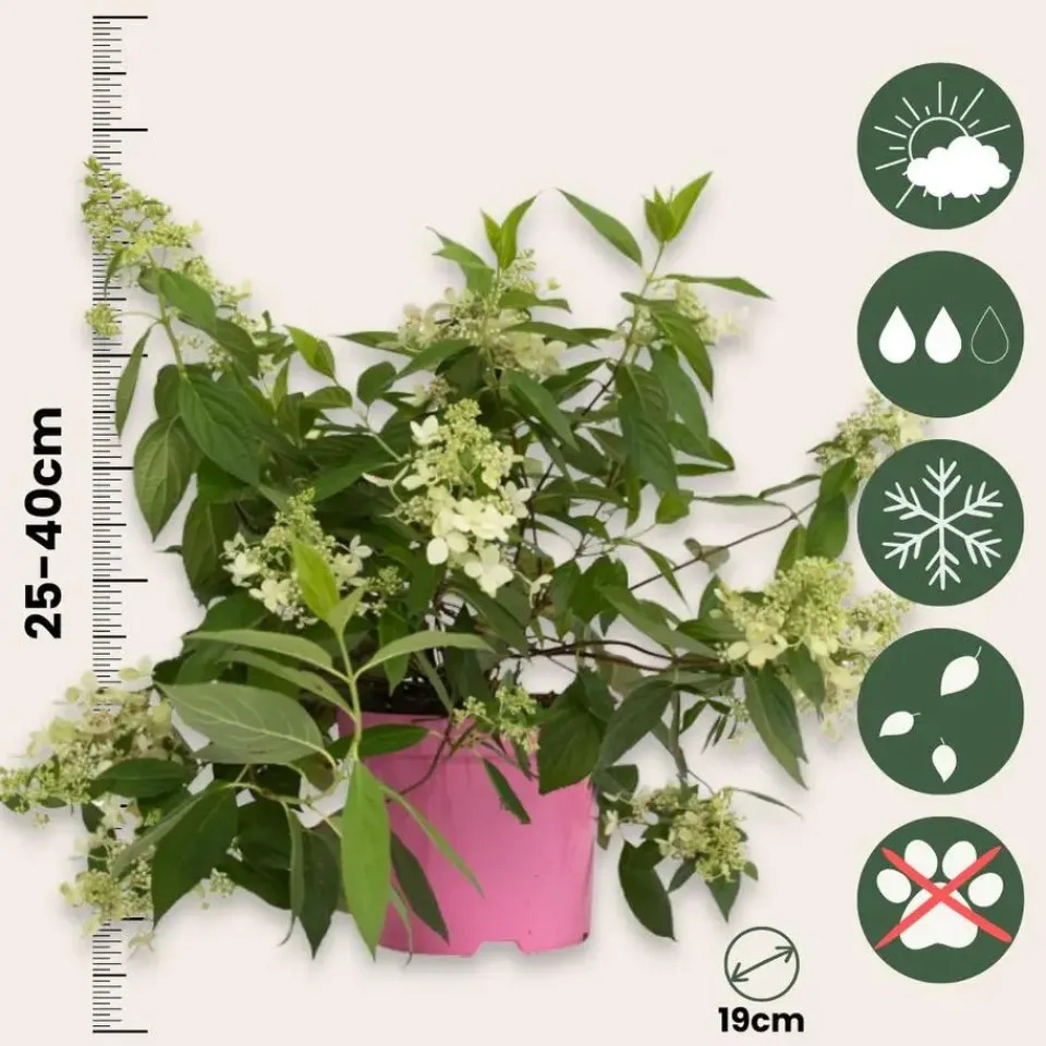Hydrangea Confetti bloeit met prachtige veervormige bloemen van de vroege zomer tot laat in de herfst. De pluimhortensia blijft compact en daardoor zeer geschikt voor een pot op terras of balkon. Ook staat de Confetti graag in de zon of halfschaduw. Hortensia’s hebben veel water nodig, vooral tijdens de zomermaanden. Bovendien is de Confetti winterhard tot -30 graden Celsius! Zo kun je elke nieuwe zomer genieten van de plant. De Confetti Hortensia kan een hoogte bereiken van ongeveer 100 cm.