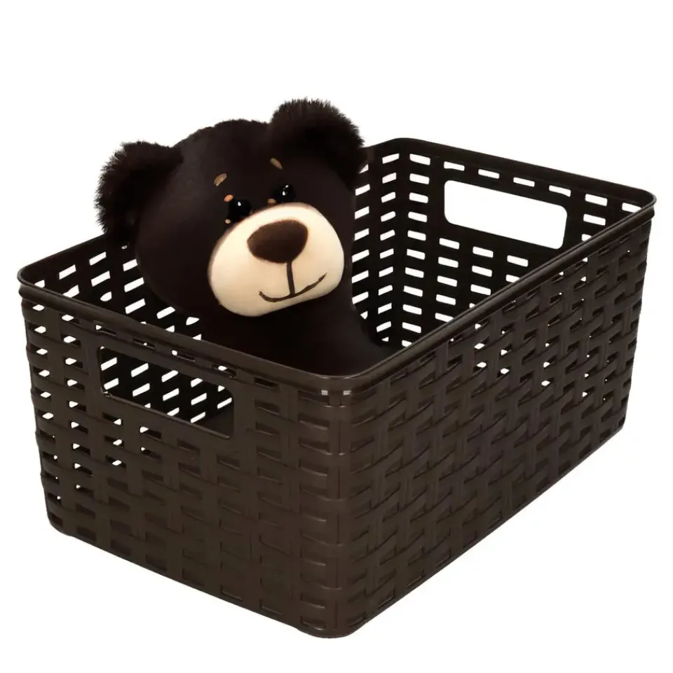 Opbergmand/kastmand gemaakt van rotan gevlochten kunststof in de kleur donkerbruin. Deze manden zijn kast-organisers of zijn prima in de woonkamer, badkamer, keuken of slaapkamer plaatsen. De mandjes zijn bijvoorbeeld geschikt voor het opbergen van speelgoed, kleding stukken, kantoor spullen, etenswaren en het opbergen van diverse spullen. Formaat: ongeveer 22 x 33 x 16 cm. Inhoud: 10 liter.