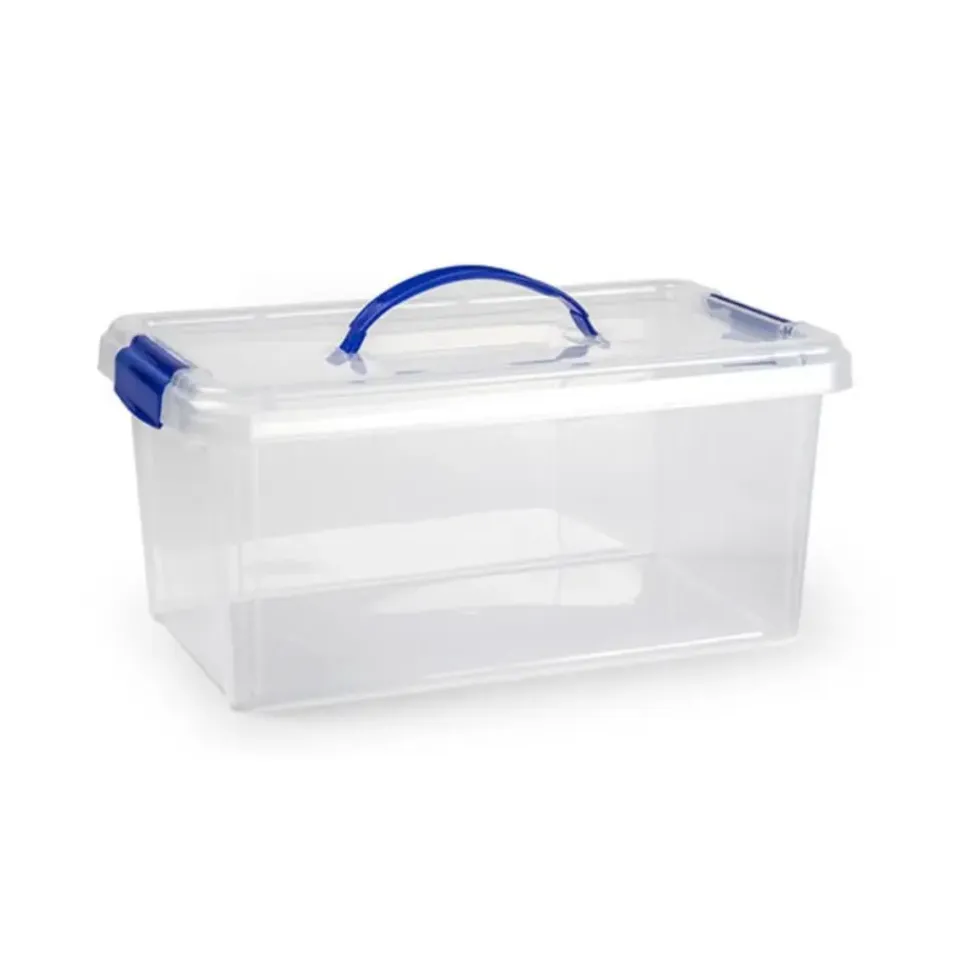Opslagbak/organizer met deksel 10 liter transparant met formaat 38,5 x 23 x 17,5 cm. Transparante opbergbakken met deksel welke is voorzien van blauwe sluitclips en hengsel. Handig voor het opbergen van spulletjes. Inhoud: ca. 10 liter. Materiaal: kunststof (plastic).