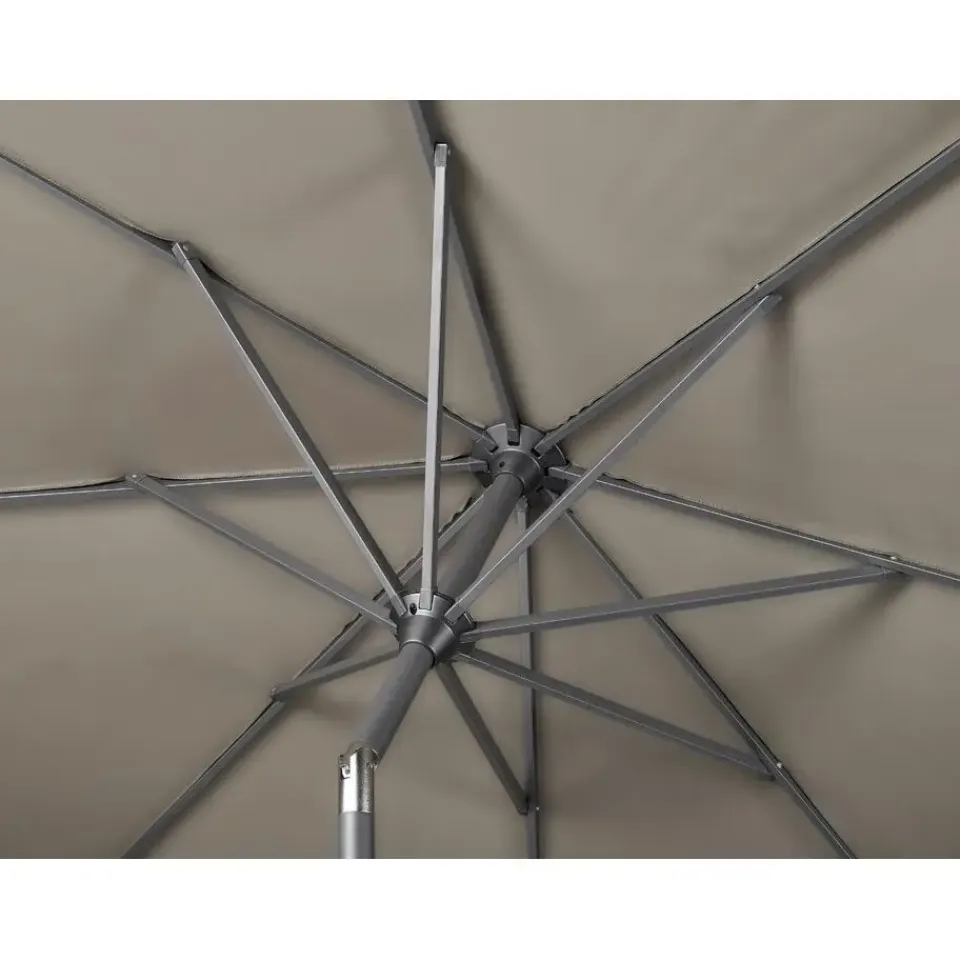 Het parasoldoek is uitgevoerd in een stijlvolle taupe kleur. Bij de productafbeeldingen kun je een kleurstaal vinden ter referentie. Het doek is vervaardigd uit 100% polyester van hoogwaardige kwaliteit en is behandeld met een speciale coating die vuil en water afstoot. Deze beschermlaag helpt ook om verkleuring van het doek tegen te gaan. Aan het uiteinde van de baleinen bevindt zich een doekspanner, die ervoor zorgt dat het doek altijd strak gespannen staat.