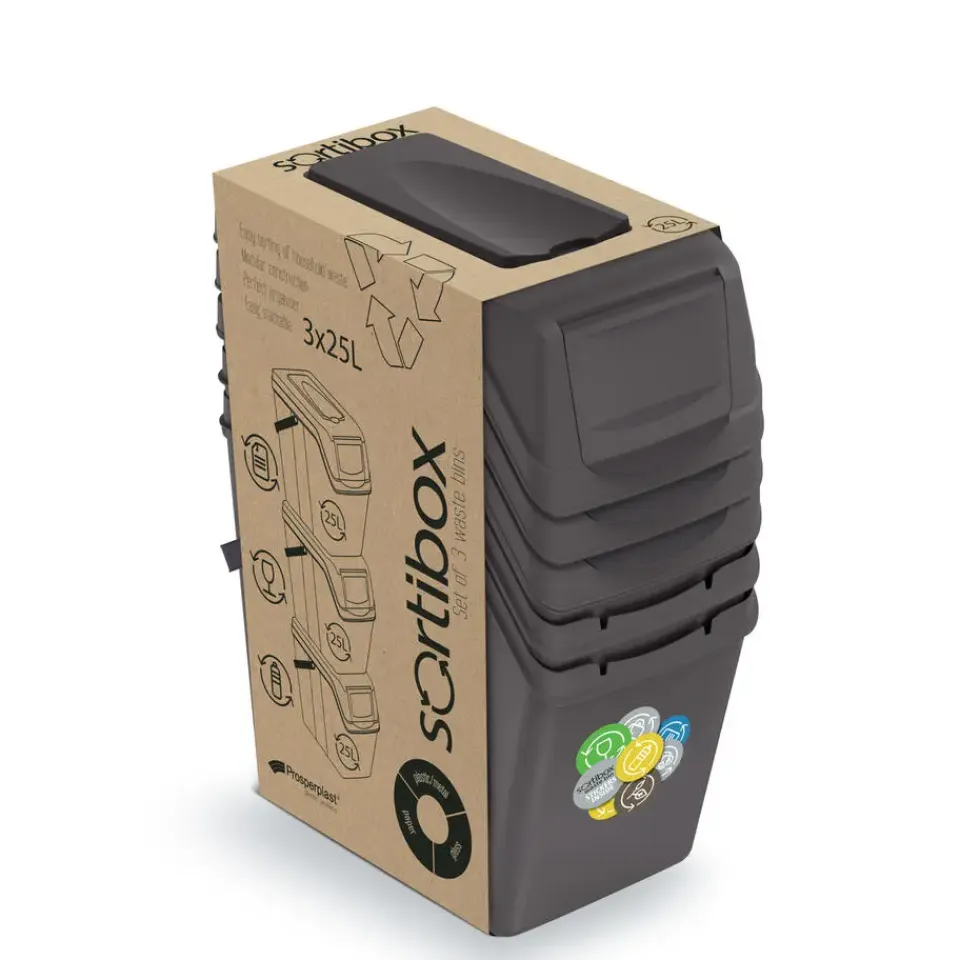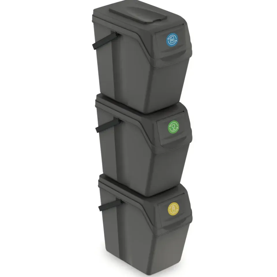 Afval scheiden wordt eenvoudiger met deze set van 3 afvalscheidingprullenbakken van Prosperplast. Elk compartiment heeft een inhoud van 25 liter, zodat je moeiteloos papier/karton, AGF en plastic kunt scheiden.