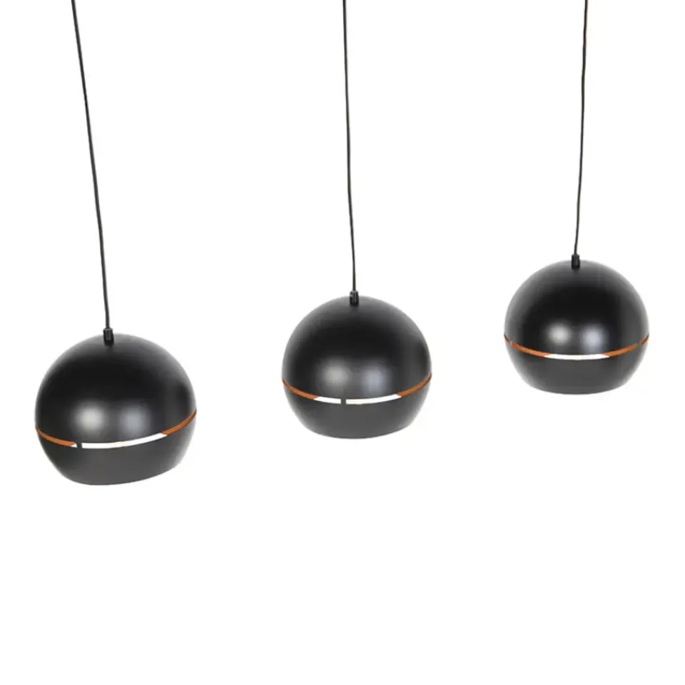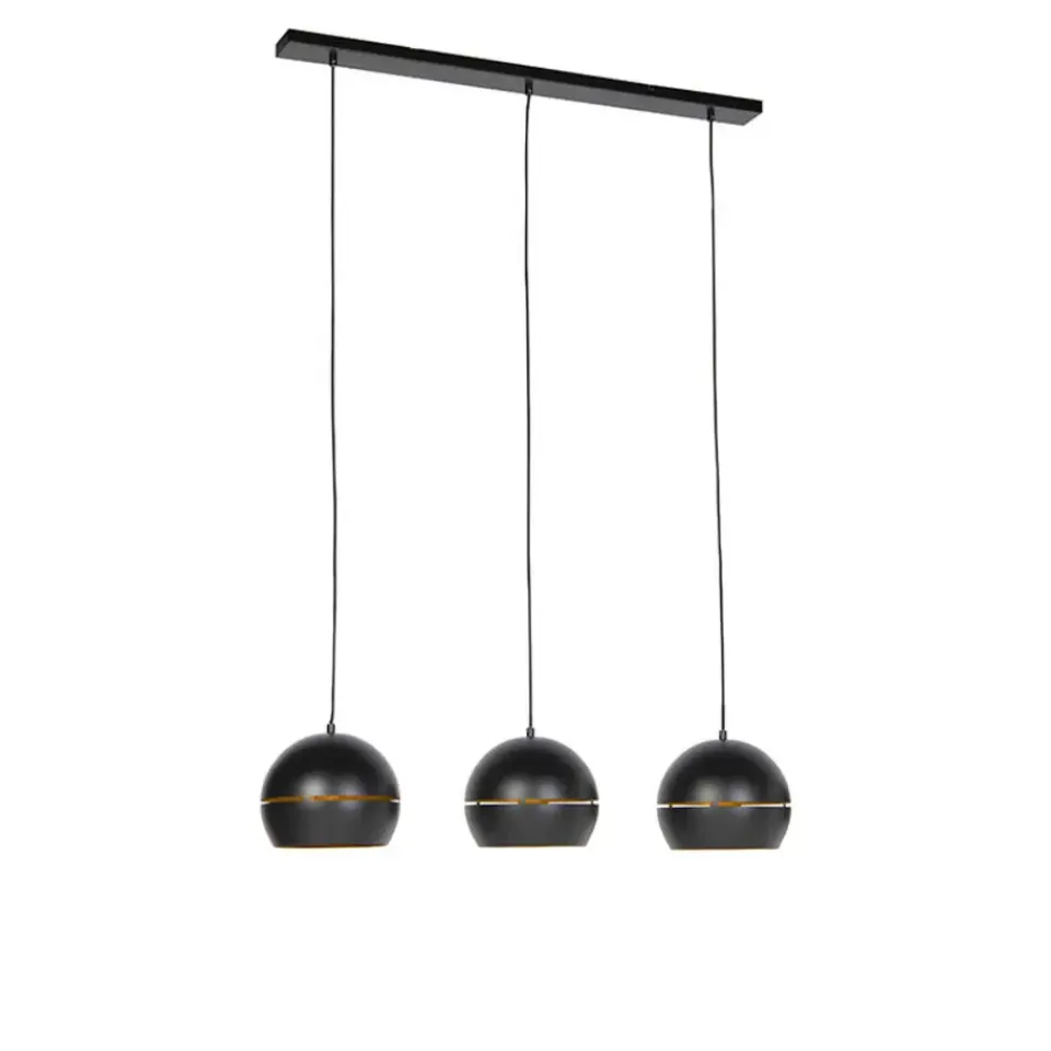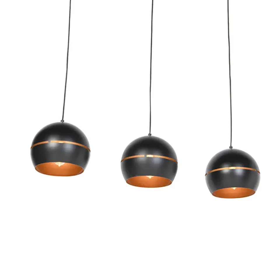 De retro ’70 hanglamp is een mooie ronde lamp, gemaakt van staal met een zwarte afwerking. Hij komt met drie lampen gemonteerd aan een montageplaat. De binnenkant van de lampenkappen is goud/messing wat voor een prachtig lichteffect zorgt. Het is een modern ontwerp in een retro jasje! In het midden van de bol zit een horizontale uitsparing, waardoor een mooie lichtval ontstaat. prachtig in de hal of eethoek.