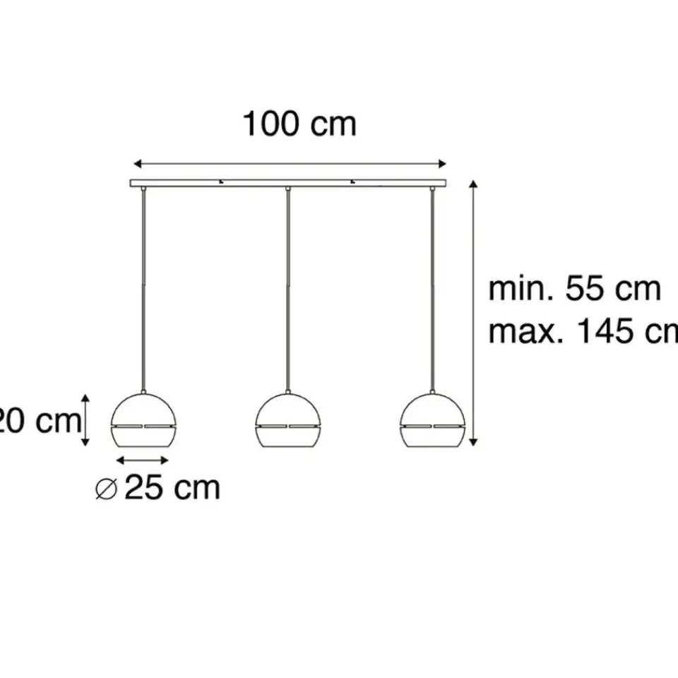 De ronde lampenkap heeft een diameter van 25 cm. De totale hoogte van de lamp is 145 cm en kun je eventueel bij de installatie inkorten op de gewenste hoogte. De montageplaat heeft een lengte van 100 cm en een hoogte van 8 cm.