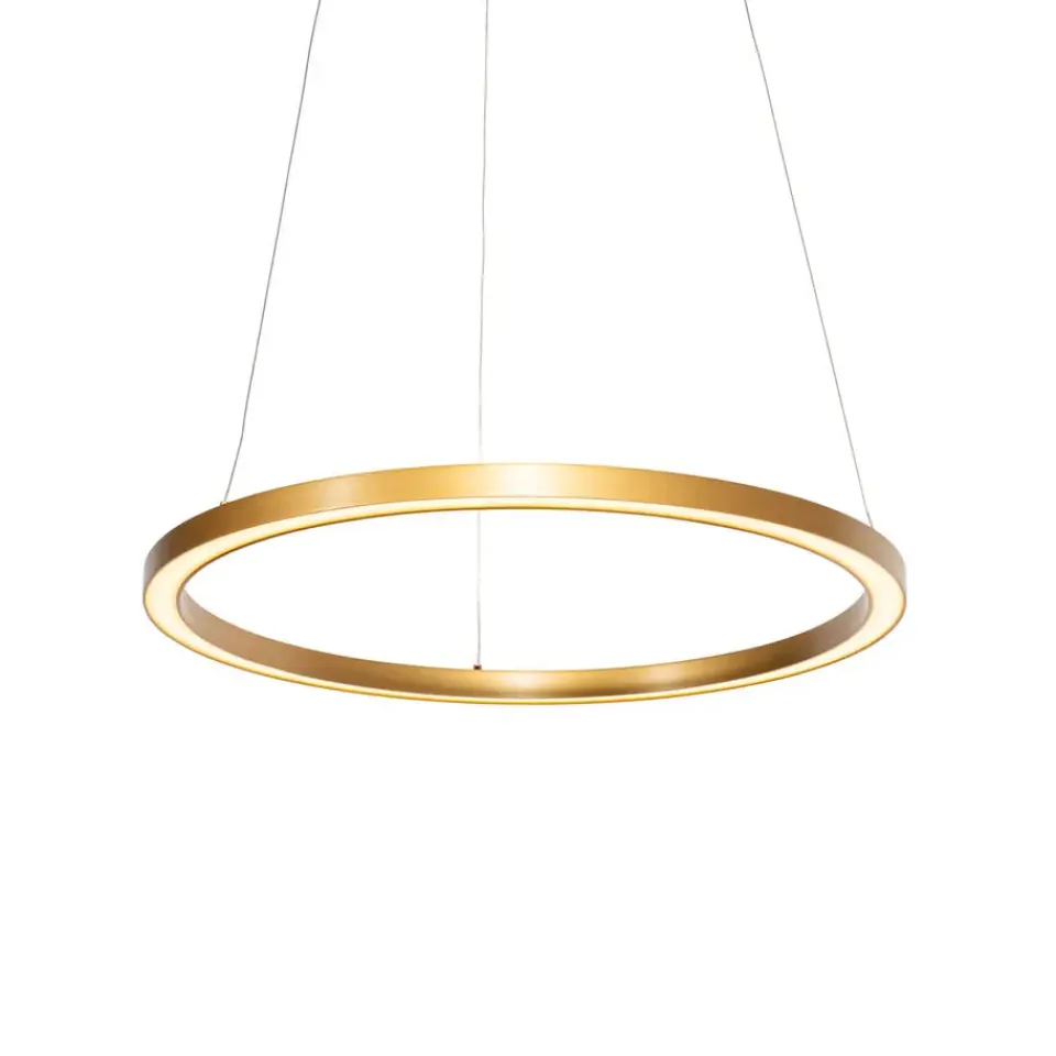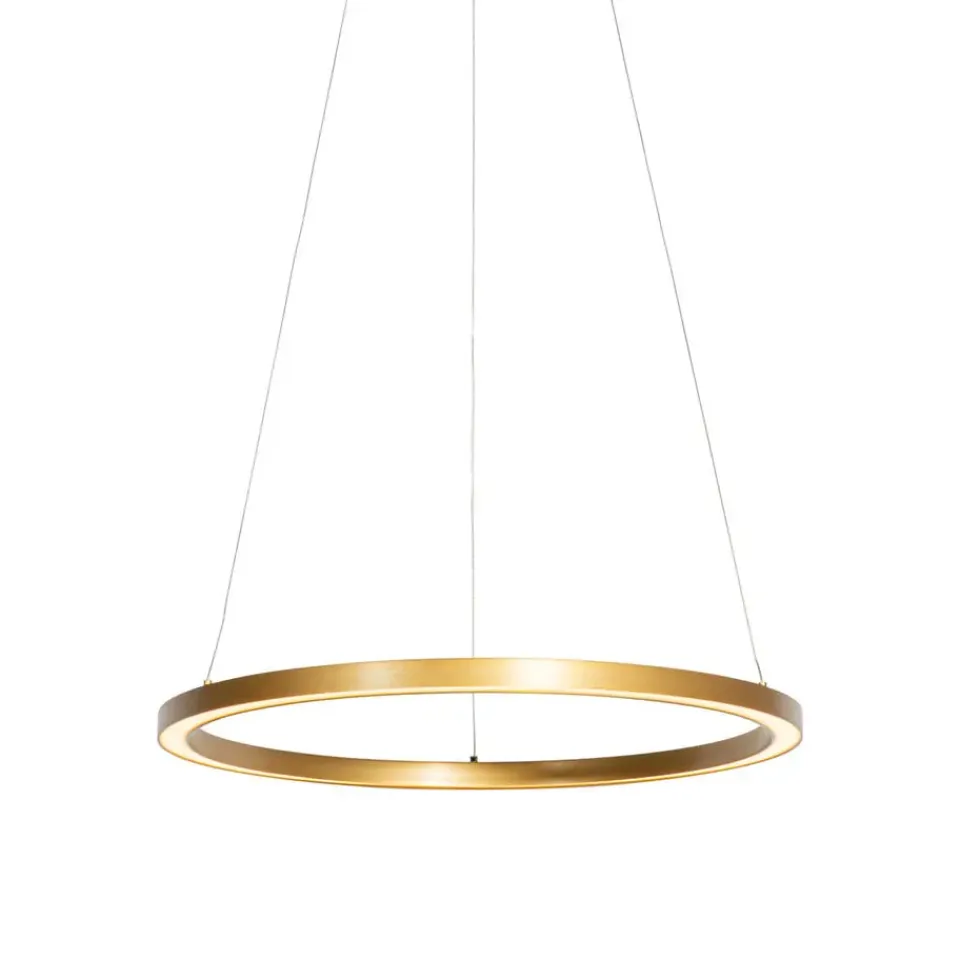 Geef je interieur een stijlvolle upgrade met de Girello hanglamp in luxueus goud! Met een diameter van 60 cm en geïntegreerde LED-verlichting, zorgt deze moderne hanglamp voor een warme gloed van 2700K die perfect is voor sfeervolle avonden. Dankzij de 3-staps dimfunctie kun je eenvoudig de lichtsterkte aanpassen aan de gewenste sfeer, zonder extra dimmer. Het slanke en minimalistische design, gecombineerd met de chique gouden afwerking, maakt deze lamp tot een echte blikvanger in elke ruimte. Of je nu je eetkamer, woonkamer of hal een verfijnde uitstraling wilt geven, de Girello hanglamp brengt elegantie en functionaliteit samen. Bestel nu en laat je interieur stralen met deze prachtige lamp!