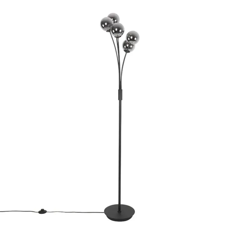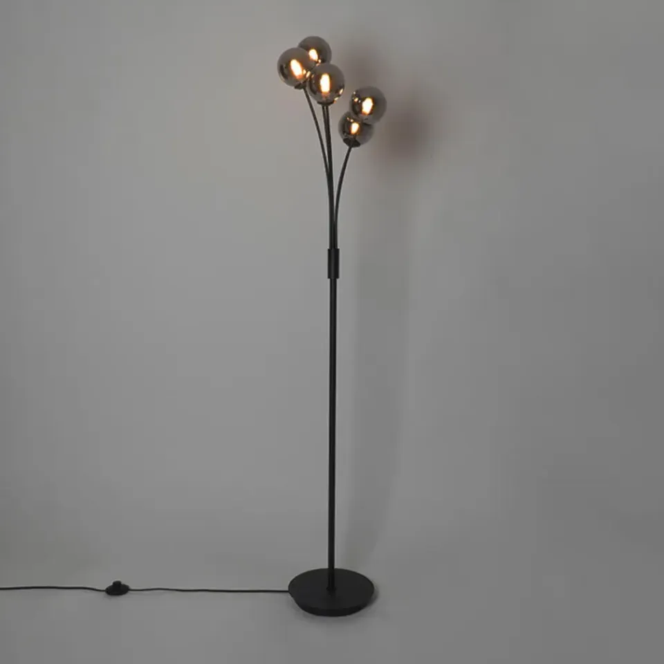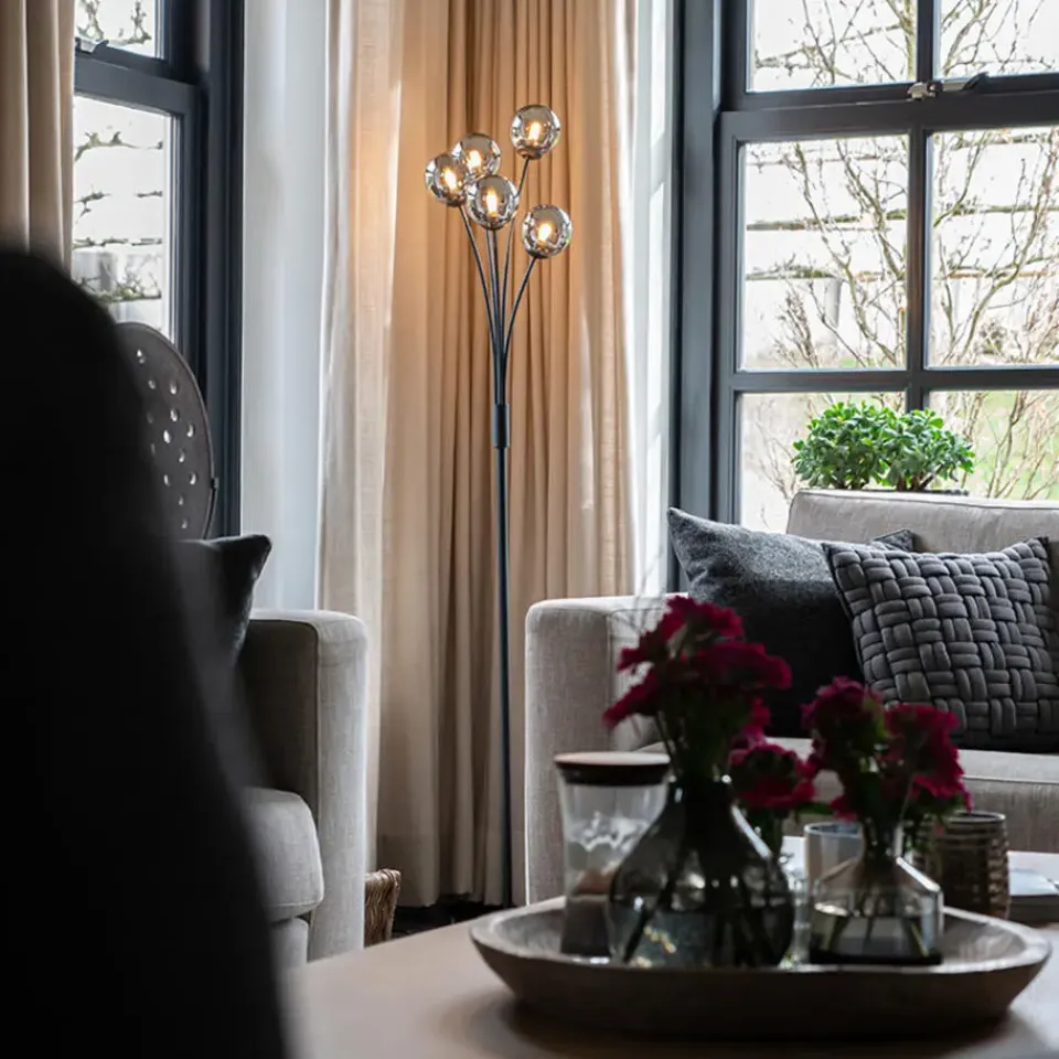 Vloerlamp Athens is een strakke en moderne vloerlamp. Perfect voor in de hoek van de woonkamer, werkkamer of slaapkamer. Doordat zwart staal met smoke glas is gecombineerd krijgt de lamp een mysterieuze uitstraling. Hij heeft een diameter van 27,5 cm en een hoogte van 160 cm. De voet heeft een diameter van 25 cm en is 2,5 cm hoog. De glazen bollen hebben ieder een diameter van 10 cm. Athens wordt inclusief snoer (250 cm) en stekker geleverd. Om de vloerlamp compleet te maken dien je vijf G9 fitting (max. 28 Watt) lichtbronnen er bij te bestellen. Wil je extra sfeer toevoegen aan de ruimte? Dan kun je de vloerlamp aansluiten op een dimmer, deze is niet inbegrepen. Van een moderne vloerlamp zoals Athens krijgt iedere ruimte een opkikker. Twijfel dus niet langer!