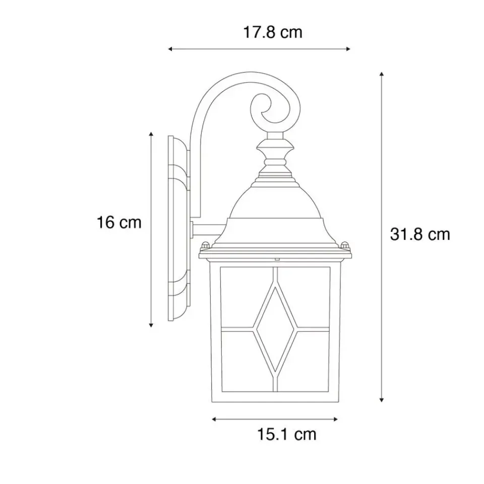 Ben je op zoek naar een klassieke, antiek aandoende buiten wandlantaarn? Dan is deze London echt iets voor jou! Door het sierlijke vintage design met ‘oud’ glas voeg je echt een vleugje stijl toe aan je voordeur/entree. Deze buiten wandlamp in hangende lantaarnvorm heeft een hoogte van 31,8 cm, een lengte van 15,1 cm en een breedte van 14,3 cm. Hij heeft een E27 fitting voor een lichtbron van maximum 60 Watt. Om het in de avond gezellig te maken kan je deze lamp ook dimmen (dimmer niet inbegrepen). Maak je tuin of voorgevel helemaal af met deze London!