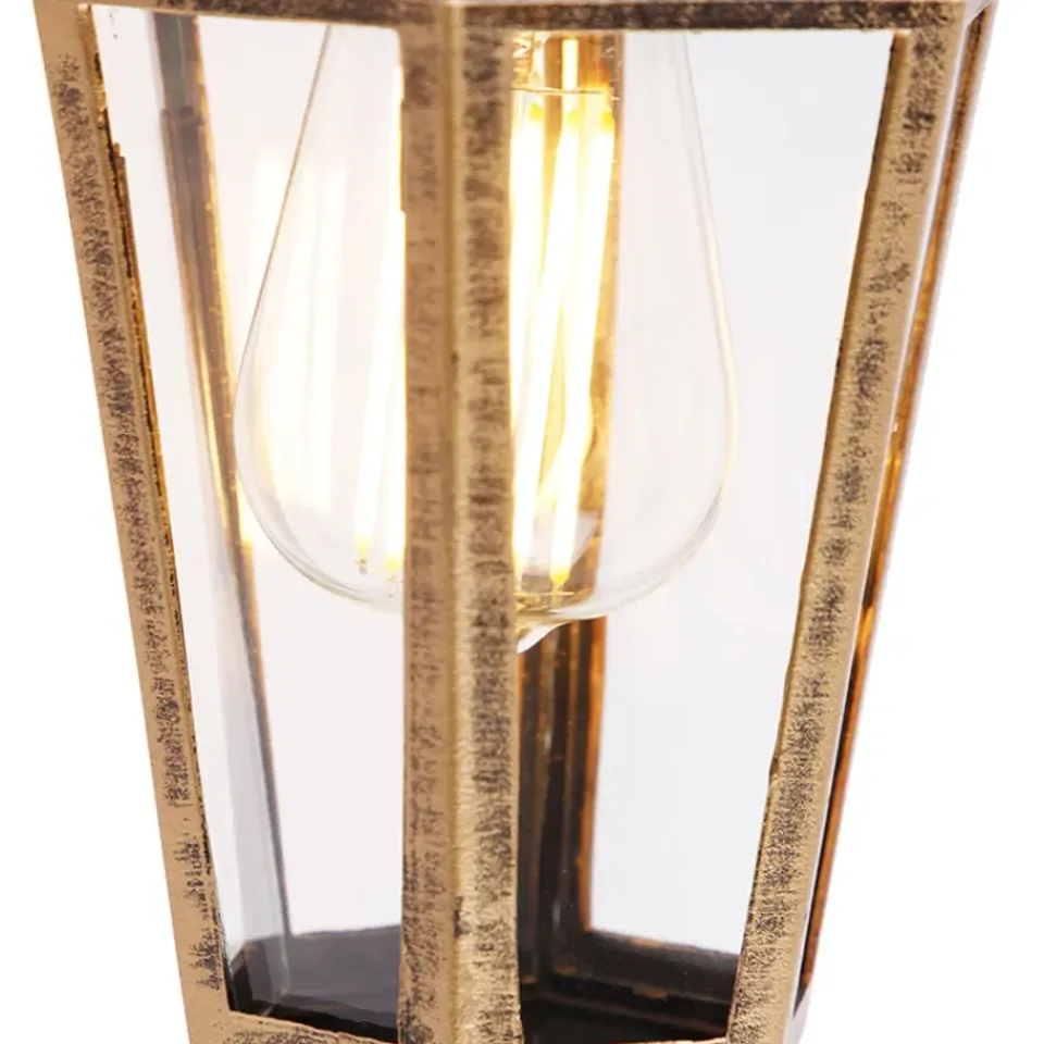 De antieke buiten wandlamp New Haven haalt een nostalgisch gevoel in je naar boven! Een buiten wandlamp zoals hij moet zijn. Hij is gemaakt van kunststof met glas en afgewerkt in het goud. De lamp heeft een diepte van 21,5 cm, hoogte van 35,6 cm en lengte van 17,1 cm. De montageplaat heeft een diepte van 1,5 cm, hoogte van 14 cm en lengte van 11 cm. Je maakt New Haven compleet met een lichtbron die beschikt over een E27 fitting (max. 15 Watt). Zorg dat je deze er nog los bij besteld. Door de hoge IP-waarde van IP44 is de wandlamp spatwaterdicht, dus geschikt voor buiten naast de voordeur of het tuinhuisje. Zorg voor een veilige buitenomgeving met de wandlamp New Haven.