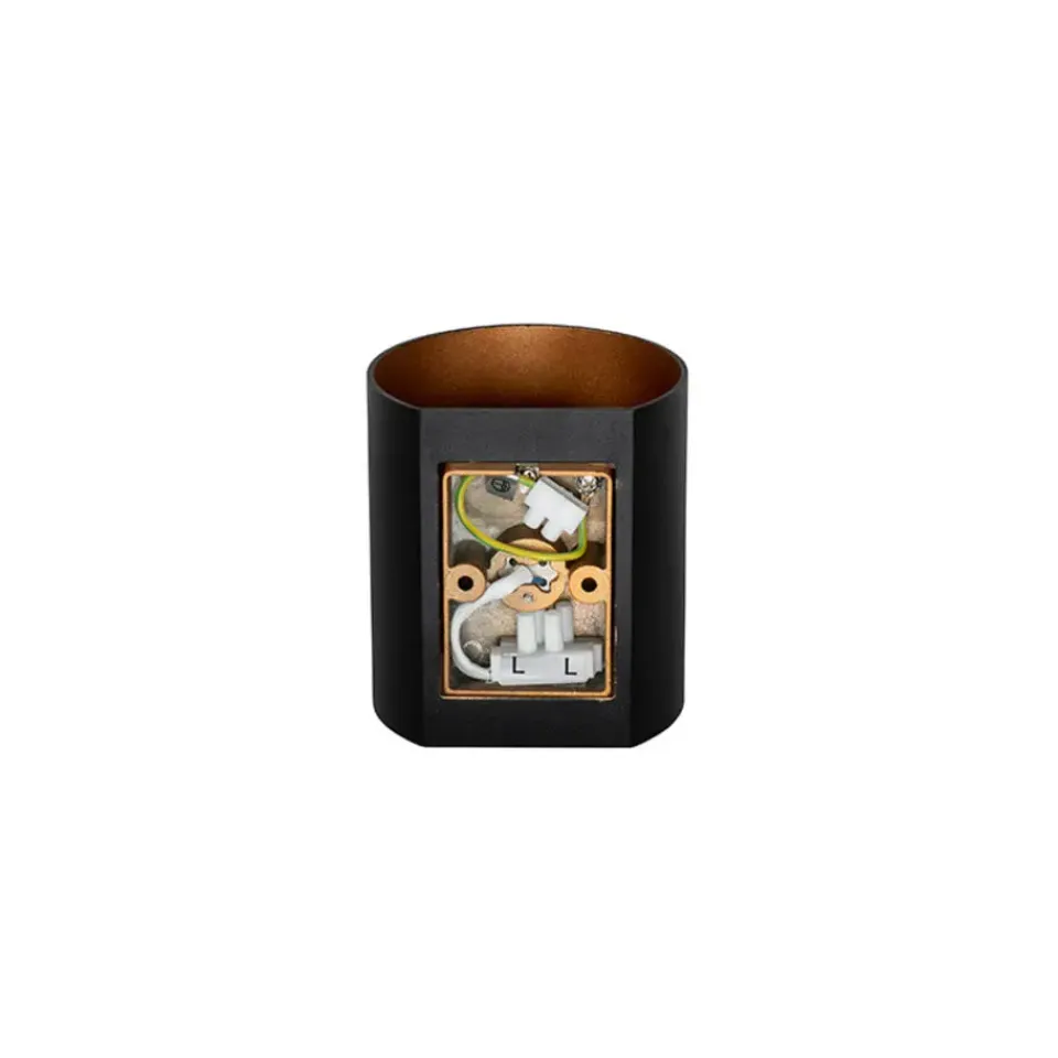 Een tijdloze, zwarte wandlamp in een minimalistisch design. Wandlamp Sabbio is toepasbaar in heel veel ruimtes in huis én ook op kantoor. Sabbio is gemaakt van aluminium en afgewerkt in het zwart. Doordat de binnenzijde is afgewerkt in messing krijgt de ruimte een warm lichteffect. Hij heeft een hoogte van 10,5 cm, lengte van 9,5 cm en een diepte van 8,4 cm. De montageplaat heeft een hoogte van 7 cm , lengte van 4,8 cm en een diepte van 2 cm. Je maakt deze wandlamp compleet met één G9 lichtbron (max. 40 Watt). Let op: deze moet je nog apart bij bestellen in de webshop. Hij is tevens dimbaar met een externe dimmer (bv. je wandschakelaar). Dankzij het open design aan de boven- en onderkant geeft de wandlamp een mooi strijklicht langs de muur. Een prachtige toevoeging in de hal, in de woonkamer of in de keuken als basisverlichting! Ga voor meer sfeer in huis met onze Sabbio.