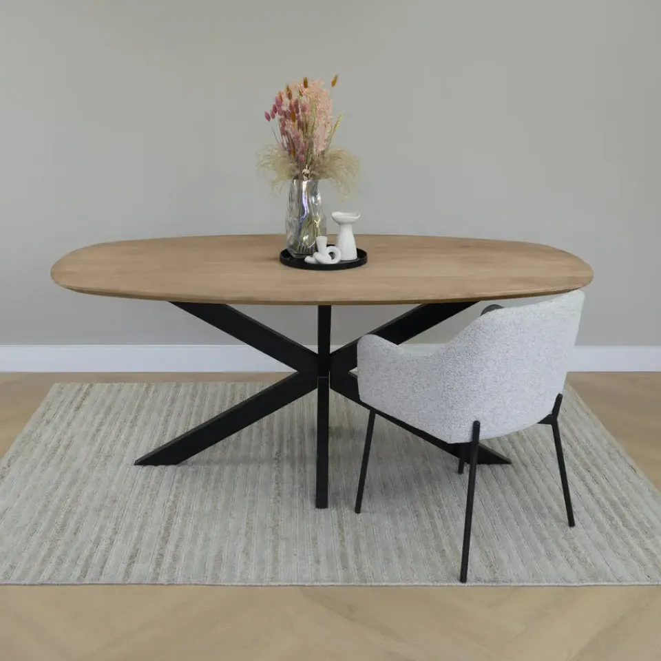 Breng de Scandinavische stijl in huis met de eettafel Sofia. Deze prachtige, Deens ovale eettafel van FSC®-gecertificeerd mangohout combineert elegantie en functionaliteit. Met een royale afmeting van 180×90 cm biedt deze eettafel mangohout voldoende ruimte voor gezellige diners of als werkplek. De stalen kruispoot geeft een industriële touch aan het tijdloze design, terwijl het mangohout een natuurlijke uitstraling creëert.