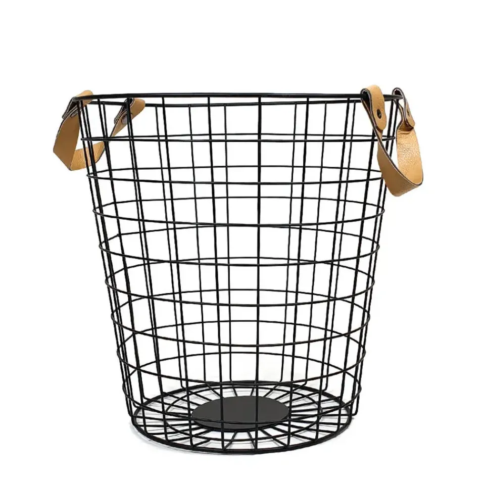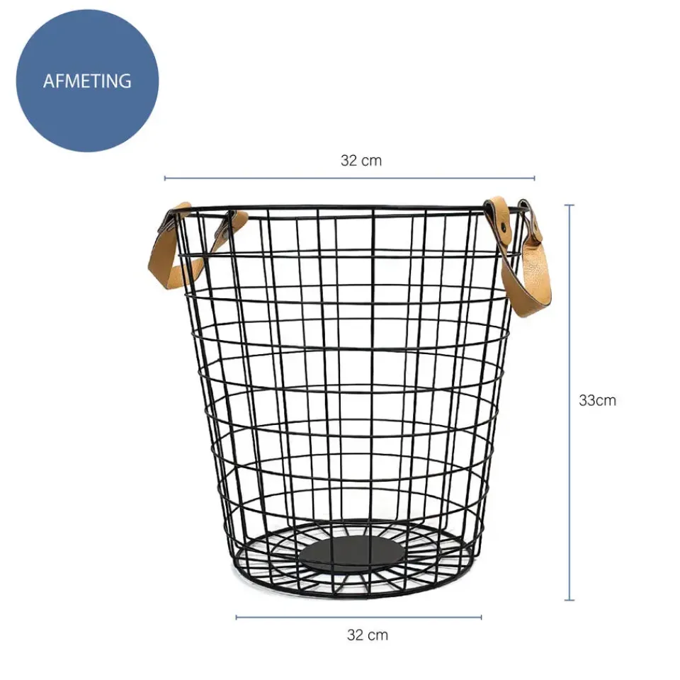 De opbergmanden hebben een ronde vorm en zijn gemaakt van draadstaal,waardoor je er mooi doorheen kunt kijken. Deze mand heeft een lengteen een diameter van 32 cm en een hoogte van 33 cm. De mand is ook in een grotere variant te verkrijgen met de volgende afmetingen 38 x 38 x 37,5 cm (lxbxh).