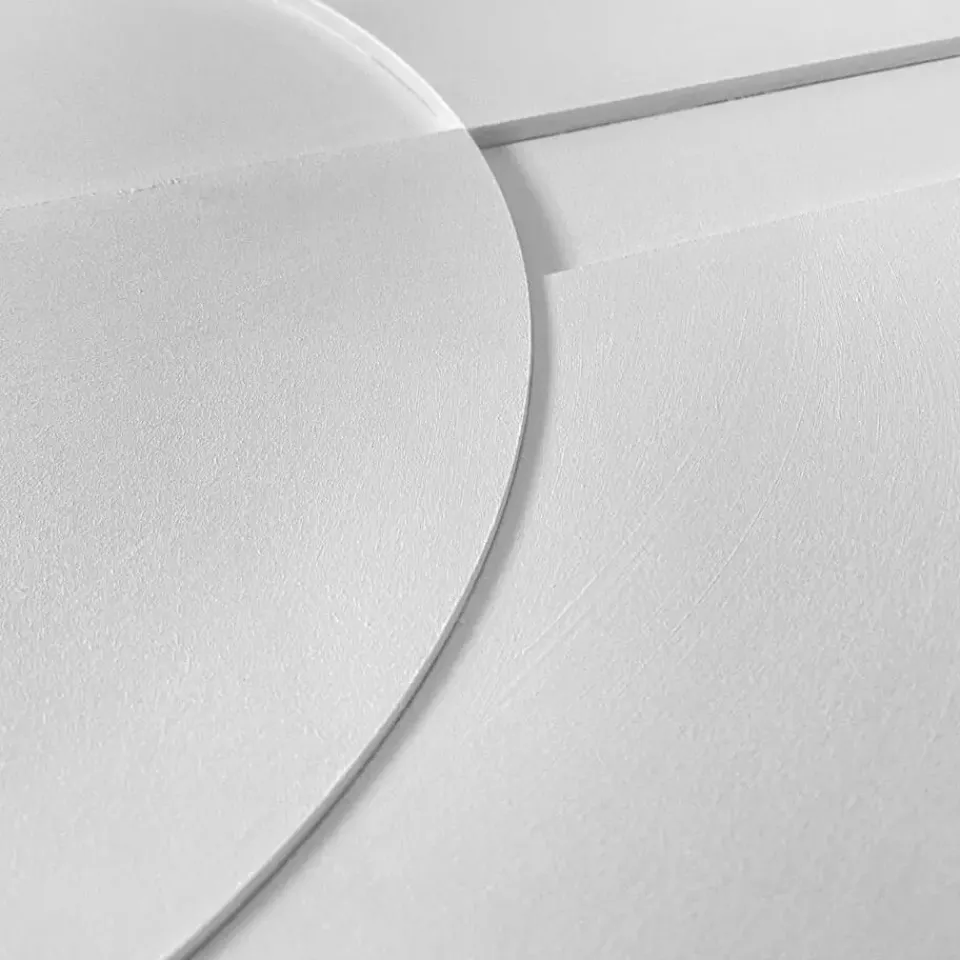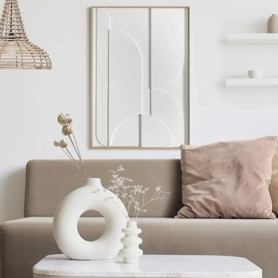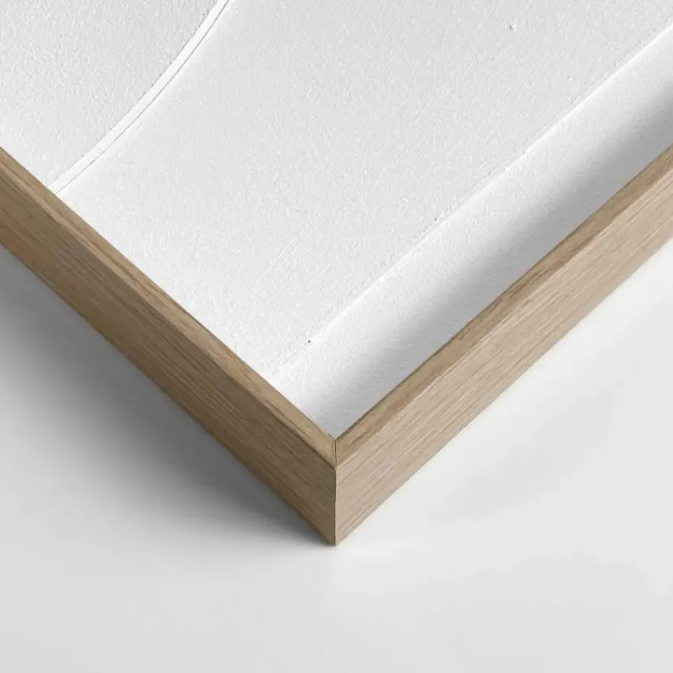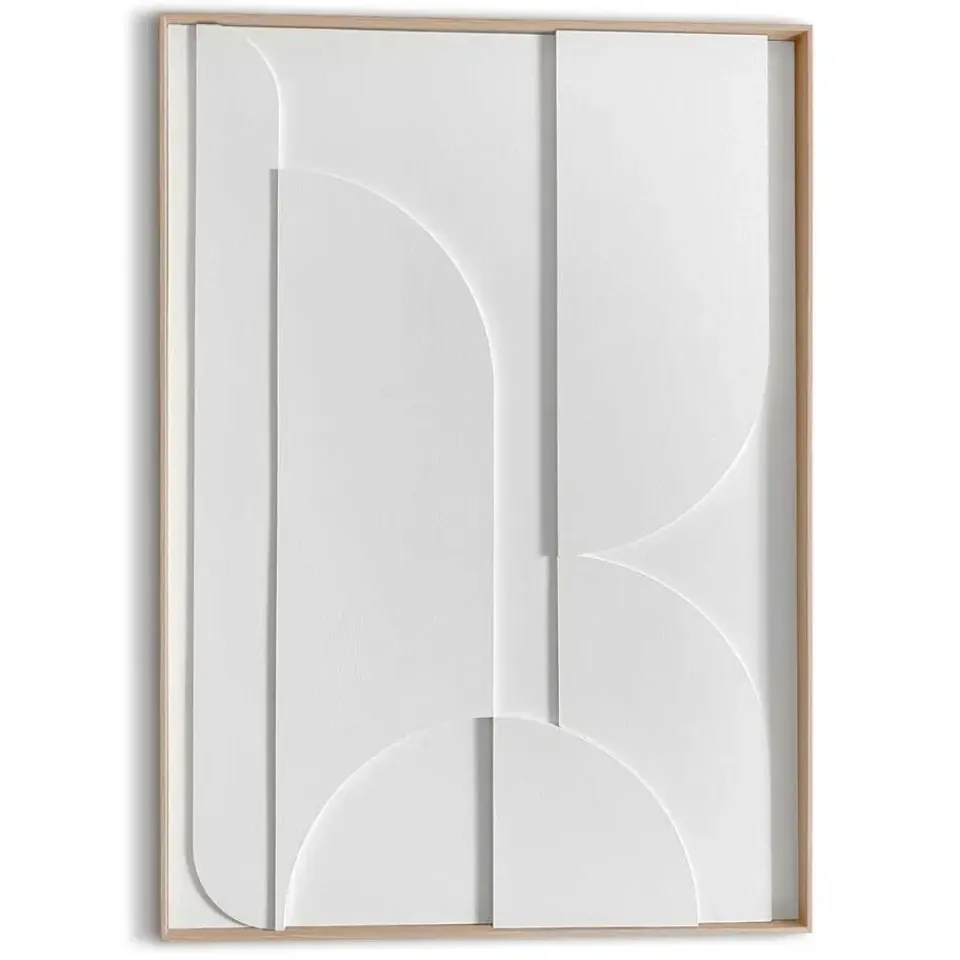 Handgemaakte wanddecoratie met abstract reliëf in wit omkadert door een houten lijst. Het scandinavisch minimalisme met 3d-textuur past in de meeste moderne woonstijlen zoals basic, vintage, urban of industrieel. Kenmerken