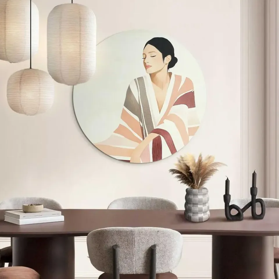 Print op 4mm dik ESG-veiligheidsglas, compleet met voorgemonteerde wandmontage en afstandhouders. De ronde vorm van de glasprint onderstreept op subtiele wijze het kenmerkende karakter van de afbeelding. Kenmerken