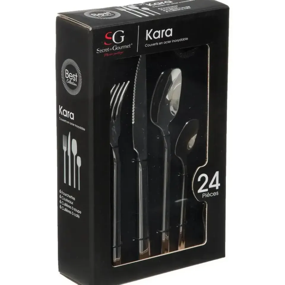 24-Delige bestekset Kara. Dek de tafel met deze moderne complete bestekset geschikt voor 6 personen. De set bestaat uit 6x snijmessen, 6x vorken, 6x lepels en 6x koffie/theelepeltjes. Materiaal: RVS. Vaatwasserbestendig.