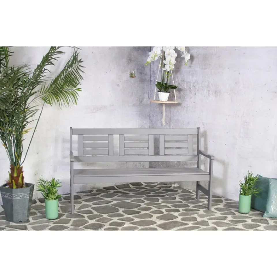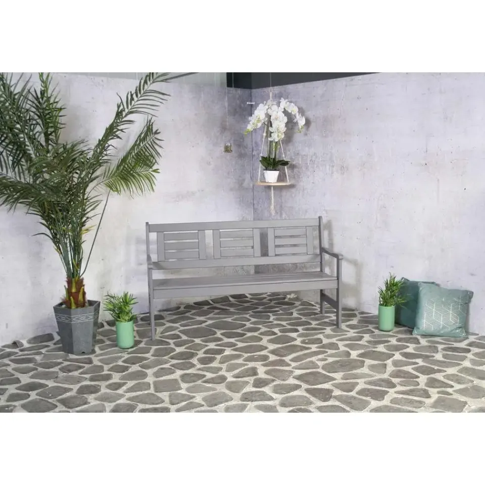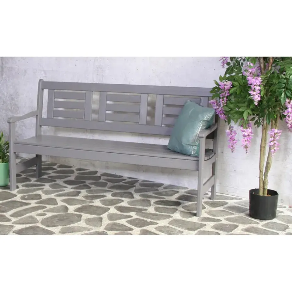 De compacte bank biedt 3 zitplaatsen voor in je (kleine) tuin, balkon of voortuin. De strak vormgegeven tuinbank is gemaakt van grenenhout en is gebeitst in een grijze kleur. Het 100% FSC gecertificeerde hout heeft een lange levensduur.