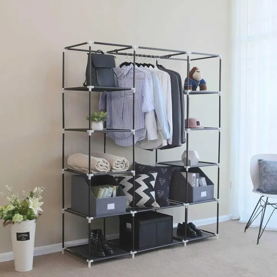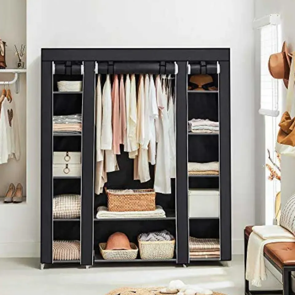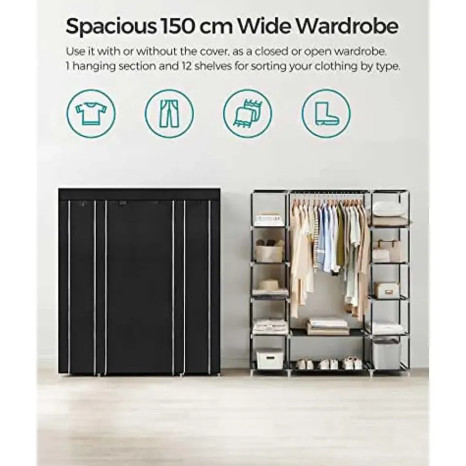 Maak kennis met onze draagbare kledingkast, een veelzijdige en ruimtebesparende oplossing voor al je kledingopbergbehoeften. Met zijn opvouwbare ontwerp en meerdere compartimenten is deze kledingopberger perfect voor slaapkamers, garderobes en zelfs studentenkamers. Een van de belangrijkste kenmerken van deze stoffen kledingkast is de grote capaciteit. Met zijn afmetingen van 45 x 150 x 175 cm biedt hij genoeg ruimte voor al je kleren. De 132 cm hoge ophangrail is speciaal ontworpen voor lange items zoals jassen en winterjassen, zodat ze goed opgeborgen en kreukvrij zijn. Hij is verdeeld in 12 secties, zodat je je kleding gemakkelijk kunt scheiden en organiseren. Hang je T-shirts en jassen aan de rail, berg opgevouwen broeken en hoeden op in de bovenste vakken en zet je schoenen op de onderste plank. Met deze garderobekast hebben al je spullen hun eigen plek, waardoor het makkelijker wordt om te vinden wat je nodig hebt.Duurzaamheid is een ander belangrijk kenmerk van deze draagbare garderobekast. Hij is gemaakt van 16 mm dikke metalen buizen, waardoor hij sterk en stabiel is. De plastic verbindingsstukken van hoge kwaliteit zorgen voor stevige verbindingen tussen de buizen, zodat de garderobe intact blijft. De 120 g/㎡ niet-geweven stoffen bekleding is zowel licht als duurzaam en beschermt je kleding tegen stof en vuil. Er is geen gereedschap nodig. Volg gewoon de bijgeleverde instructies en steek de buizen in de plastic verbindingsstukken. In een mum van tijd heb je een volledig geassembleerde kledingkast, klaar om je kleding in op te bergen. Het gemak van deze draagbare garderobekast houdt daar niet mee op. De stoffen bekleding is voorzien van een rits, zodat je hem gemakkelijk dicht kunt ritsen en je kleding beschermd blijft tegen stof. Je kunt de deur ook oprollen en open houden in je slaapkamer, zodat je gemakkelijker bij je kleding kunt terwijl je je klaarmaakt.Onze draagbare kledingkast wordt geleverd in een strakke zwarte kleur, die een vleugje elegantie toevoegt aan elke kamer. De gebruikte materialen zijn van hoge kwaliteit, wat de duurzaamheid en lange levensduur van de kledingkast garandeert. Hij is bestand tegen een maximale statische belasting van 5 kg per legplank en 15 kg voor de hangrail.Kortom, onze draagbare kledingkast biedt een praktische en ruimtebesparende oplossing voor je kledingopslag. Met zijn grote capaciteit, gecategoriseerde opslag en duurzame constructie houdt deze kledingkast je kleding georganiseerd en gemakkelijk toegankelijk.