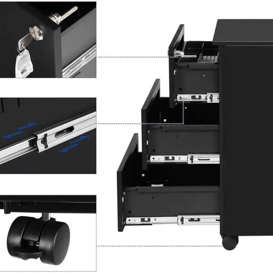 Is er altijd chaos op uw bureau of kantoortafel, dit verrijdbare ladeblok met 3 laden helpen je georganiseerd aan het werk te gaan. De kast heeft ook een verwijderbare organizer, waar u notities, paperclips, enz. kunt opslaan. Bewaar alle belangrijke documenten in deze rolcontainer! Elke lade is uitgerust met 2 verstelbare palen, zodat u hangmappen kunt opbergen in verschillende formaten (A3, A4, A5, enveloppen en meer).